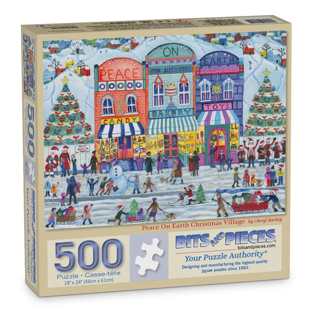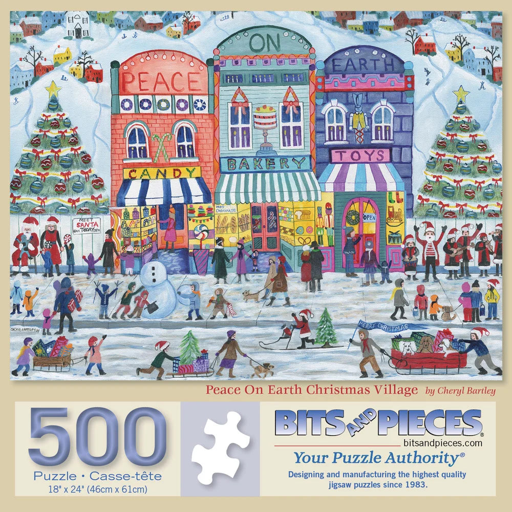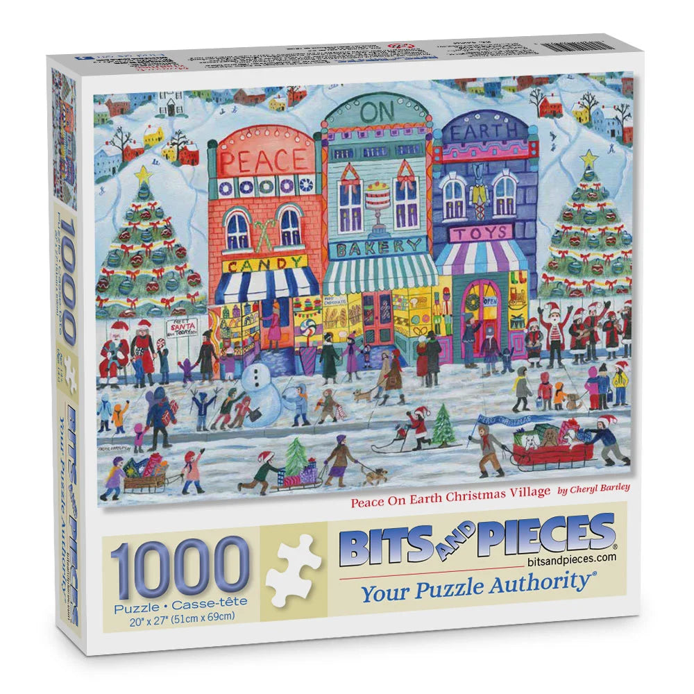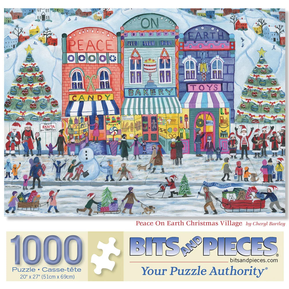 Step into a joyful winter wonderland with Peace on Earth Christmas Village by Cheryl Bartley. This festive town square is buzzing with holiday spirit, from skaters twirling on the ice to shoppers exploring charming storefronts. With every puzzle piece, you’ll feel the warmth and whimsy of small-town Christmas magic.