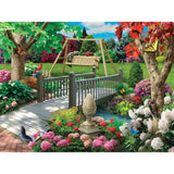 Step into a garden oasis where nature’s beauty is in full bloom. A charming wooden bridge leads to a cozy swing, inviting you to relax beneath a sky of soft, drifting clouds. Vibrant flowers, fluttering butterflies, and cheerful birds bring this peaceful park to life in stunning detail. Designed by Alan Giana, this 1000-piece puzzle is a serene escape, perfect for unwinding as you piece together this tranquil retreat.