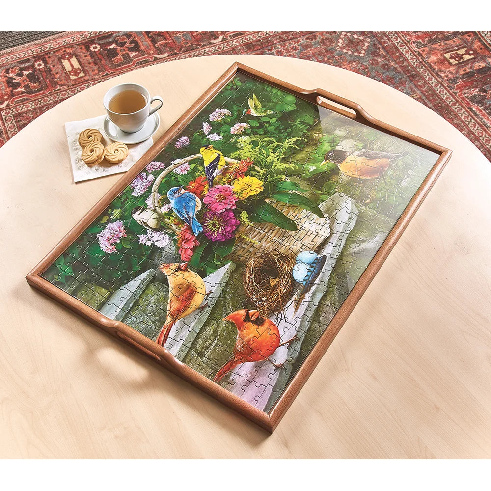 Introducing the Puzzle Artistry Serving Tray - where creativity meets practicality. Crafted from solid hardwood, this felt lined tray securely holds and displays your favorite 18" x 24" puzzle. Removable acrylic cover transforms the tray into a classic serving tray for stylish serving and easy clean up. Enjoy your favorite artwork for as long as you like, and when inspiration strikes, simply swap it out for a new design. Spot clean. Not watertight. Overall 25-1/2" x 19-1/2" x 1".