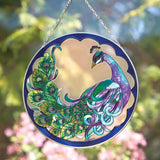 The majestic peacock is captured in an artistic suncatcher for a stunning window display. Hand painted in vivid translucent color includes a metal chain for hanging. Looks beautiful from inside or outside the window. A striking gift measuring 9-7/8" in diameter.