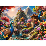 Let the vibrant beauty of Peacock Majesty by Yuri Khrushch take you away to an enchanting world of color and elegance. This stunning puzzle features majestic peacocks perched amidst a lush garden bursting with vivid flowers, cascading waterfalls, and graceful butterflies. In the background, a serene mountain temple rises above a stone bridge, framed by cherry blossoms and dramatic peaks. Perfect for nature lovers and puzzle enthusiasts, this dazzling scene invites you to immerse yourself in its breathtaking details while enjoying a relaxing challenge. Piece together this masterpiece and escape into the majestic beauty of Peacock Majesty!
