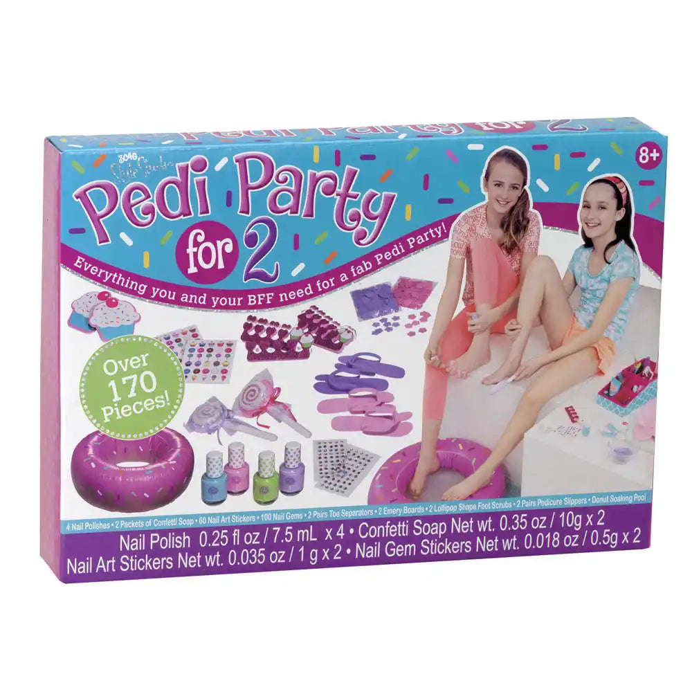 Enjoy hours of fun with your bestie having the perfect pedicure! Great for sleep overs, play dates and rainy days. Set includes a donut foot bath, lollipop foot scrubs, cupcake emery boards, glitter cupcake toe separators, confetti soap, two pairs of pedi slippers, nail polish, nail stickers and adhesive gems. Ages 8 and up.
