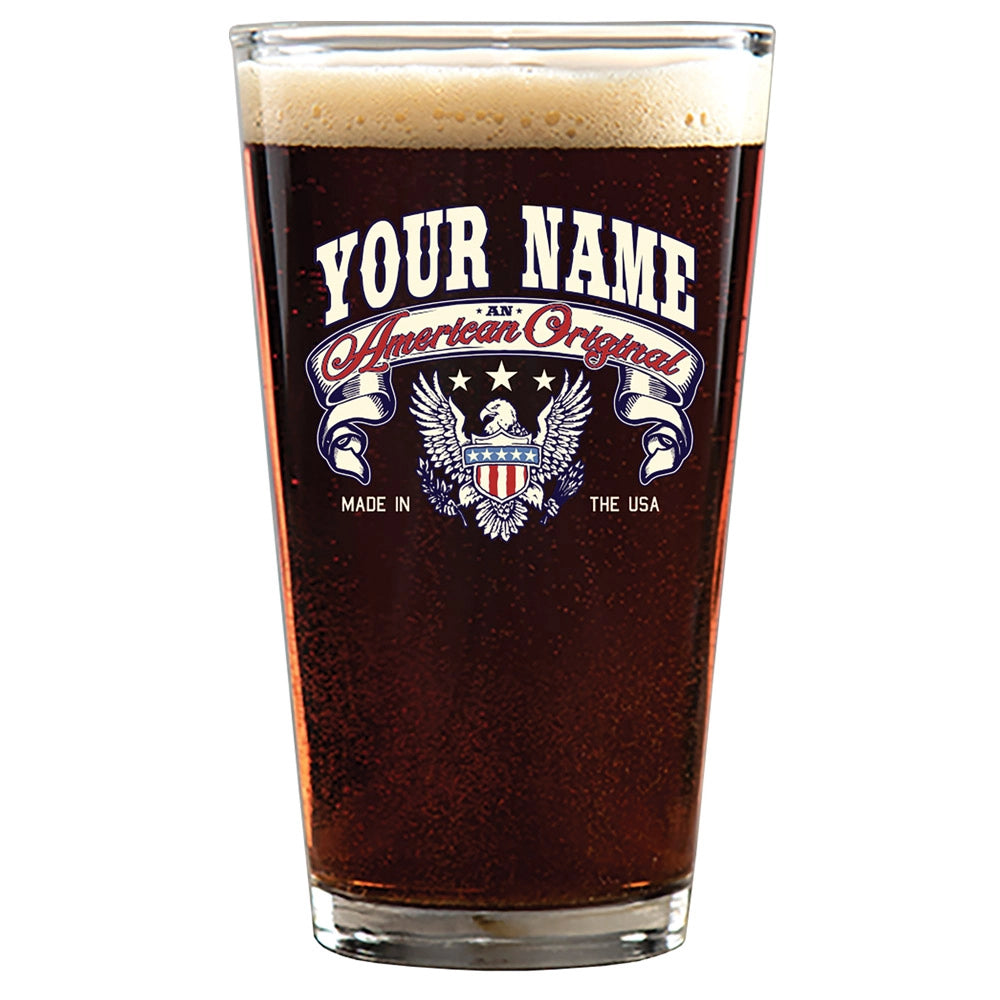 Raise a glass to the name you’re proud to carry. This personalized pint glass features your family name above the phrase “American Original” in a bold Americana design. Great for bar setups, man caves, or thoughtful gifts, this glass is a toast to tradition and the American spirit.