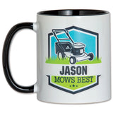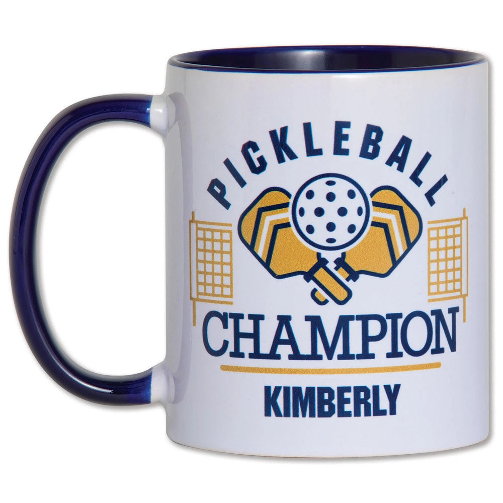 Ceramic mug holds 11 ounces. Dishwasher and microwave safe. State up to 16 characters. Choose between "Mows Best" or "Pickleball Champion" designs.