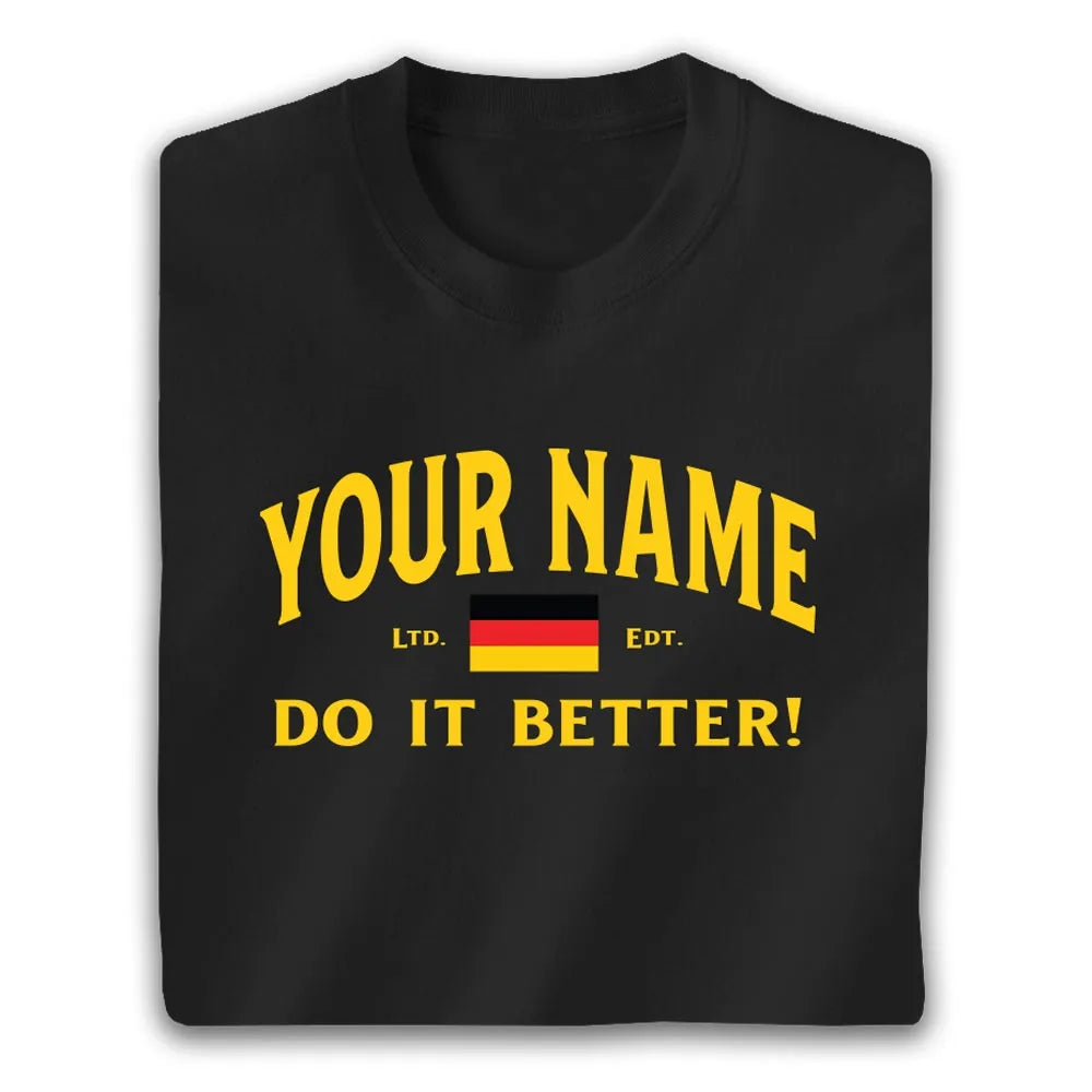 Show your pride and make it personal with our Personalized Germans Do It Better Shirt. 100% Cotton shirt features the bold colors of the German flag and the fun phrase “Do It Better,” you can add your name (up to 16 characters) for a unique, custom touch. Perfect for family gatherings, Oktoberfest, or showing off your German roots in style.
