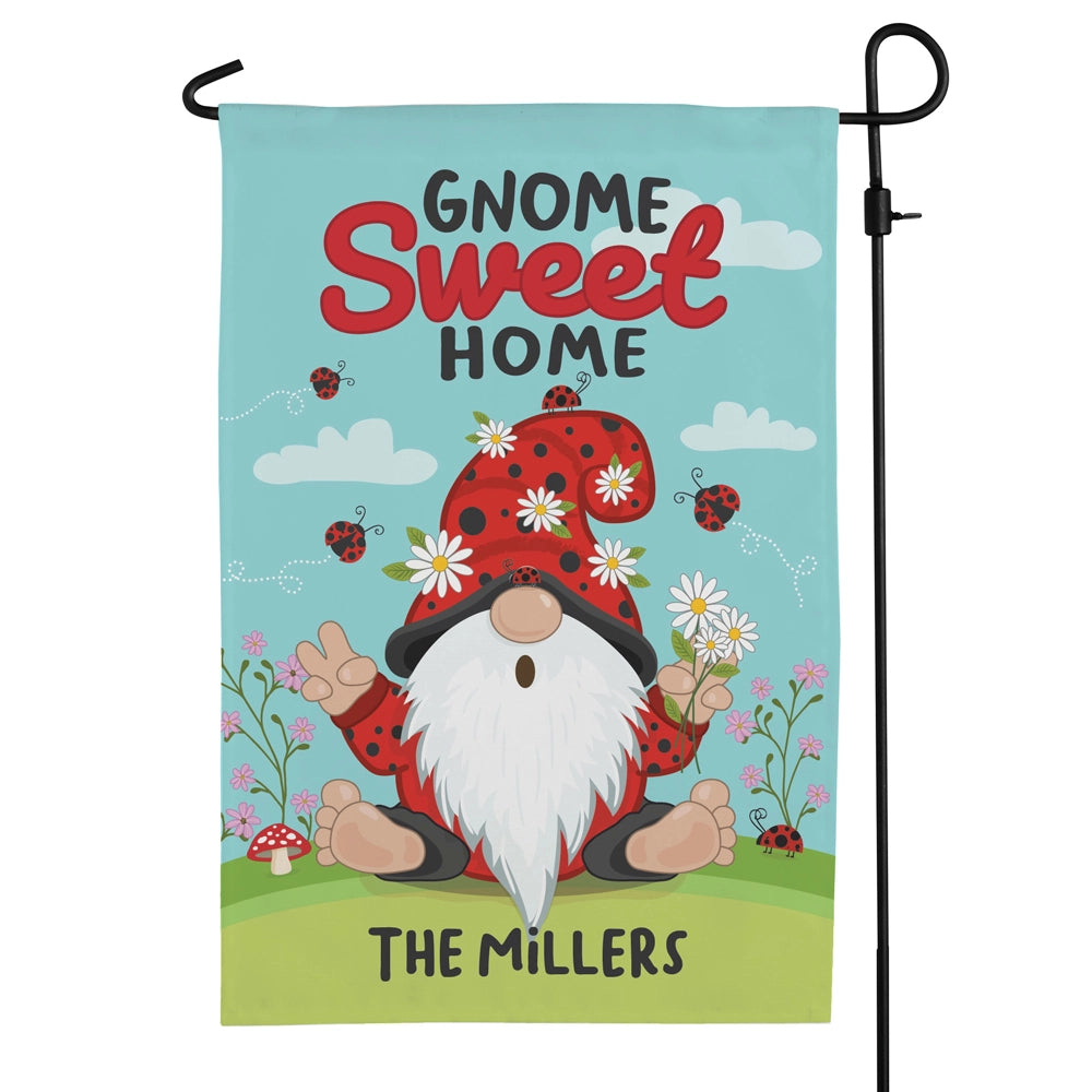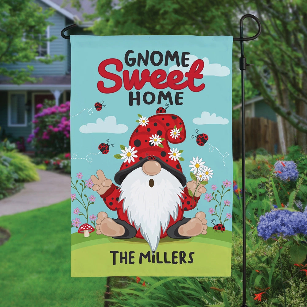 Welcome guests with a cheerful touch of whimsy. The Personalized Gnome Sweet Home Garden Flag features a jolly gnome surrounded by mushrooms, butterflies, and spring blooms, ready to greet visitors with a smile. Made from vibrant polyester and measuring 12"h x 17-1/2"w, it’s a charming way to add personality to your yard, walkway, or garden. Add your family name or a custom message—up to 24 characters—to make it truly your own. Personalization appears exactly as entered, so be sure to include “The” if desired. Wrought iron flag stand measures 39-1/4" high, and is sold separately. Please allow 2 to 3 weeks for delivery.