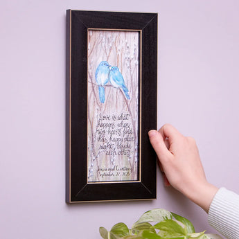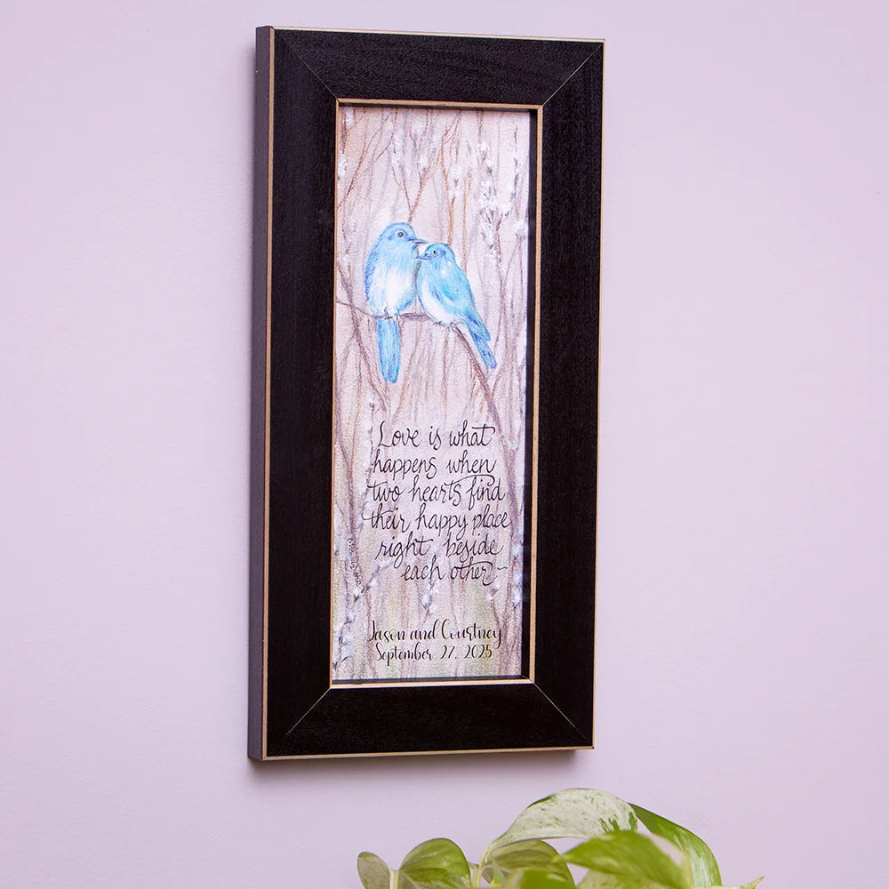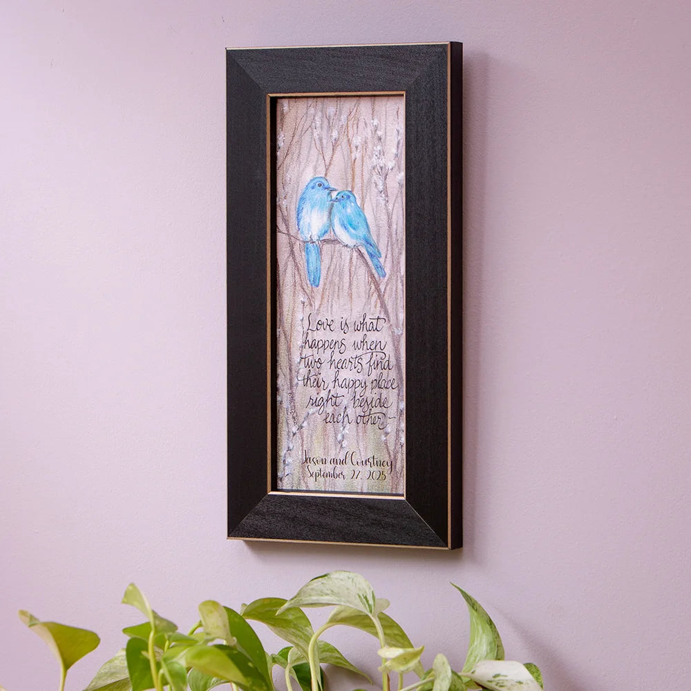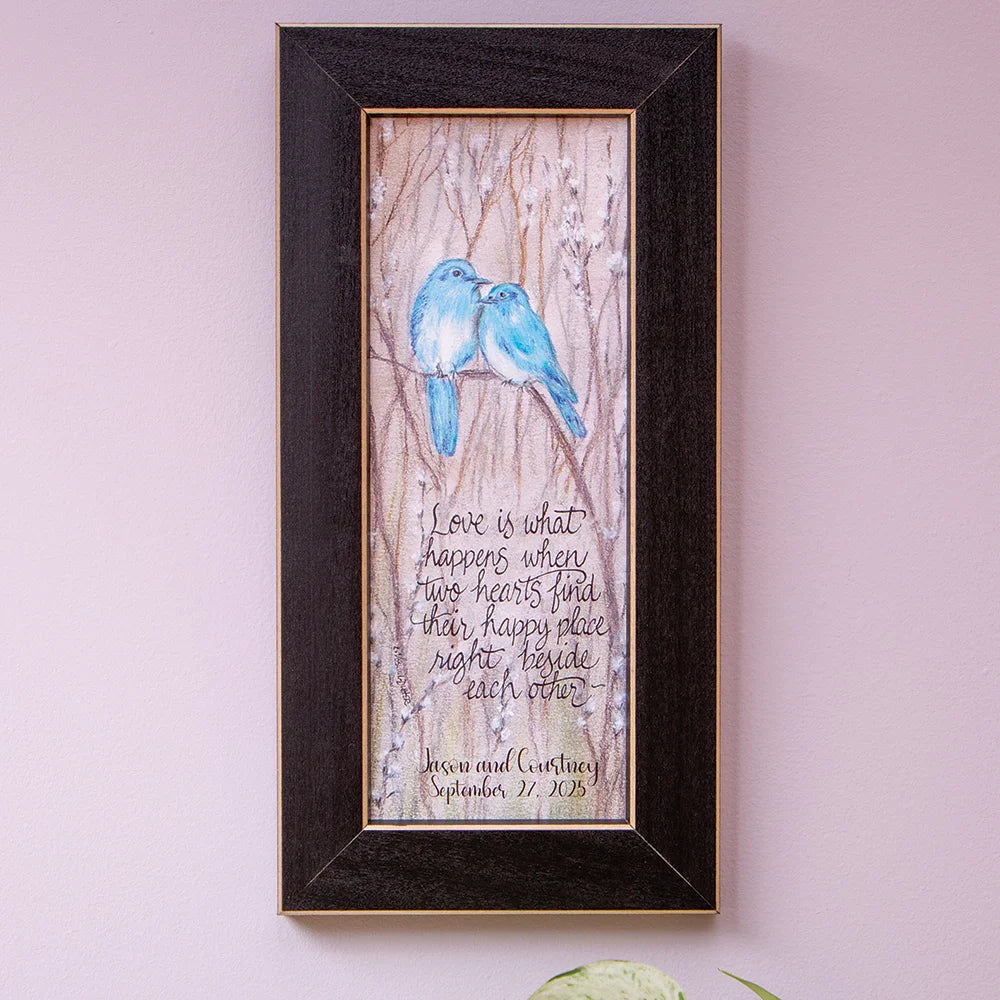 "Love is what happens when two hearts find their happy place right beside each other." Artist Lori Voskuil-Dutter uses watercolor, pastel and ink to create this sweetly serene scene. The perfect wedding or anniversary gift for the lovebirds in your life. Specify names and an important date or message to make it even more special. Line 1: up to 18 characters. Line 2: up to 16 characters. Print comes framed in wood, under glass with a hanging hook on back. Measurements 12” x 6”.
