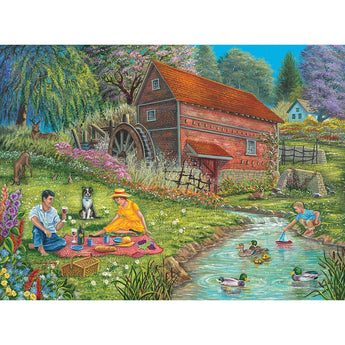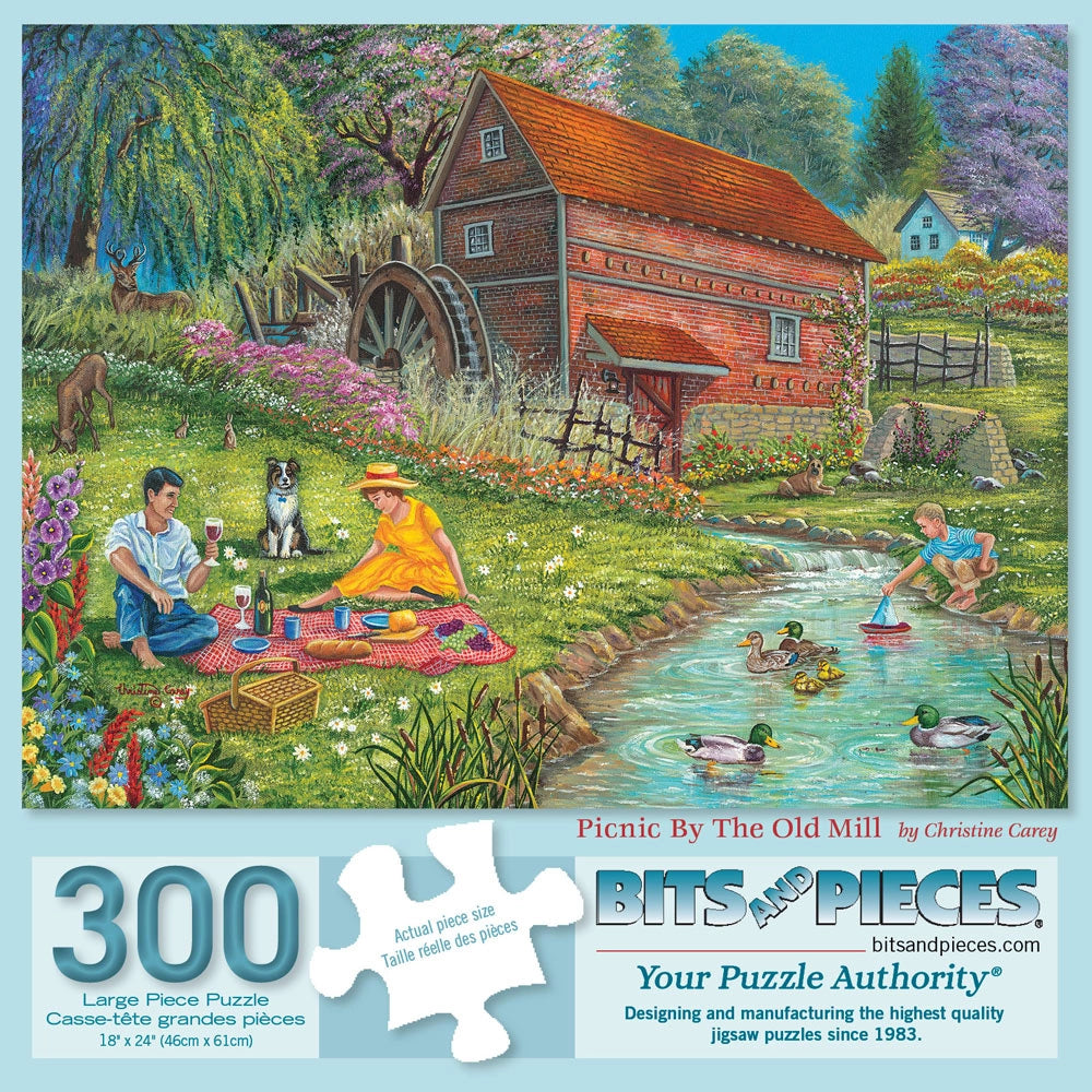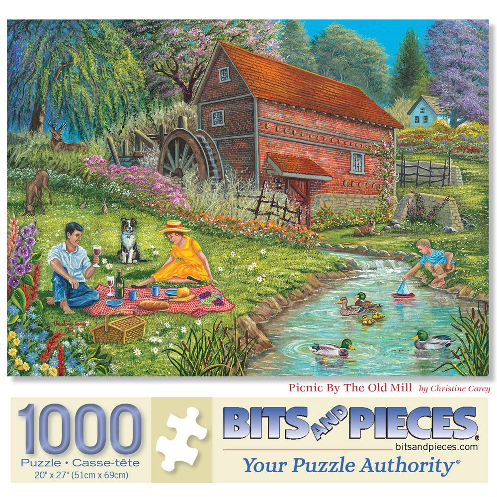 Christine Carey's "Picnic by the Old Mill" puzzle beautifully captures a tranquil countryside scene. Featuring a charming mill, a serene stream, and a delightful picnic setting, this design invites you to escape to a simpler time. Ducks, blooming flowers, and vibrant greenery add life to the idyllic landscape. Perfect for puzzle enthusiasts seeking a peaceful challenge.