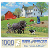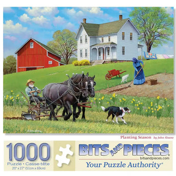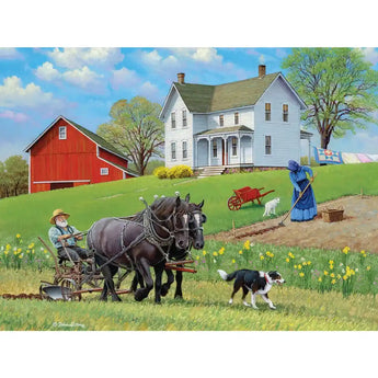 This John Sloane jigsaw puzzle, encapsulates the essence of farm life in a tableau. As you fit each piece, you're invited to a vibrant spring day on the farm, where hard work under the open sky is the spirit of the day. A farmer guides his horses, turning the rich earth in preparation for planting, while in the background, a woman plants seeds for future blooms. A curious pup adds a touch of whimsy to the scene. Assembling this puzzle is like painting a love letter to the time-honored tradition of tilling the land. Available in multiple piece count. Puzzles are renowned for their engaging complexity, offering a satisfying challenge with their smaller, intricate pieces.
