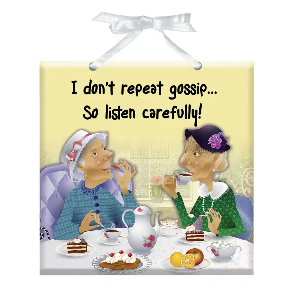 Keep your gal pals laughing with these wonderfully funny wall plaques. From a little innocent gossip time and a look back on those wild weekends, to the best bad influencer and that one eccentric friend, there's something for everyone in your inner circle. Each full-color ceramic plaque measures 6" square and includes a ribbon with bow for hanging. Give our whimsical plaques as gifts to your special friends who have been with you through thick and thin.
