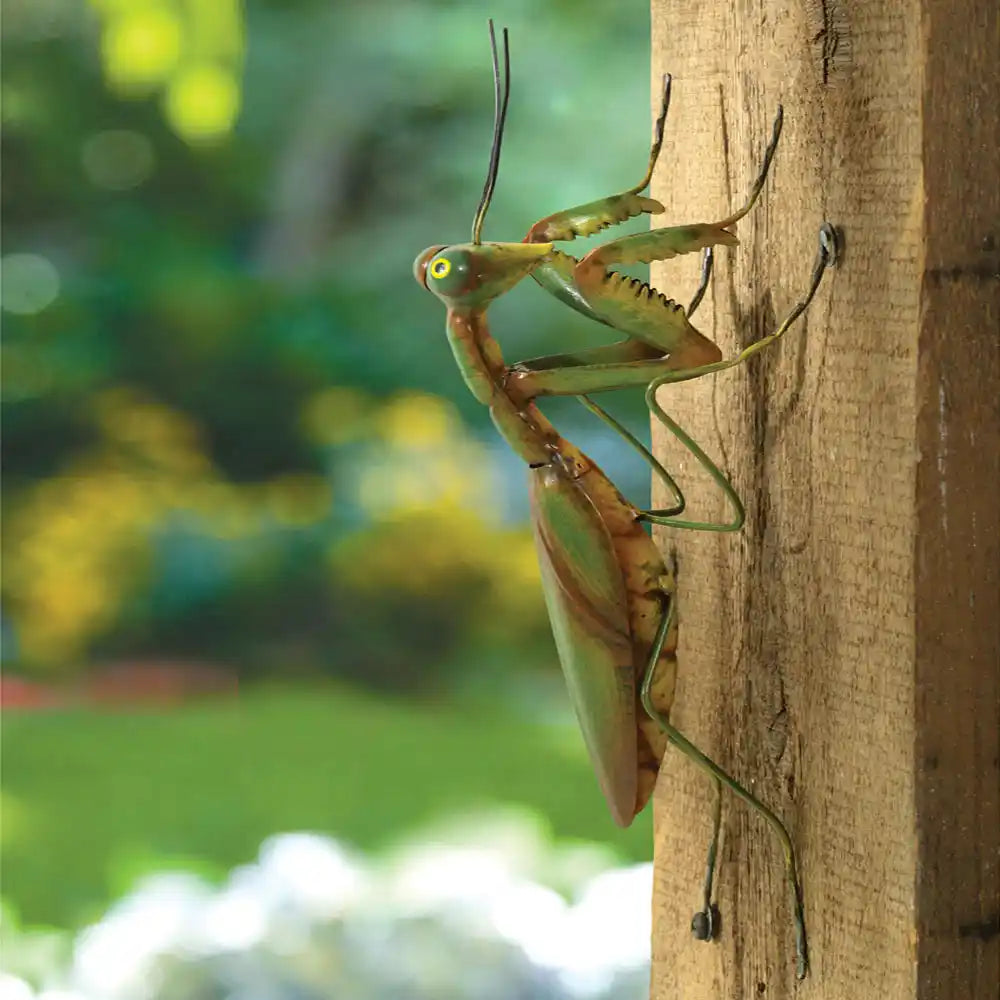 Our metal praying mantis will stand guard in your yard while you are away from your gardens. These insects hold up the fronts of their bodies and position their huge forelegs, when at rest it appears as though they are praying. A charming way to add a sense of whimsy and style to your home. Hang from holes on its feet or let rest on a flat surface. Measures 12" x 5" x 3½".