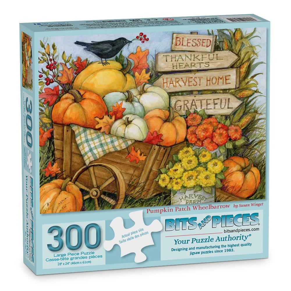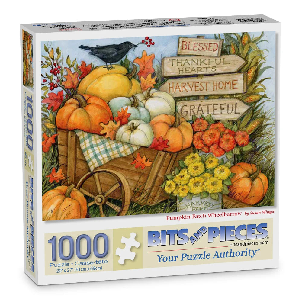 Susan Winget’s Pumpkin Patch Wheelbarrow jigsaw puzzle overflows with pumpkins, sunflowers, and rustic harvest signs. A cozy autumn scene perfect for fall décor lovers, country charm fans, and seasonal puzzle collections.