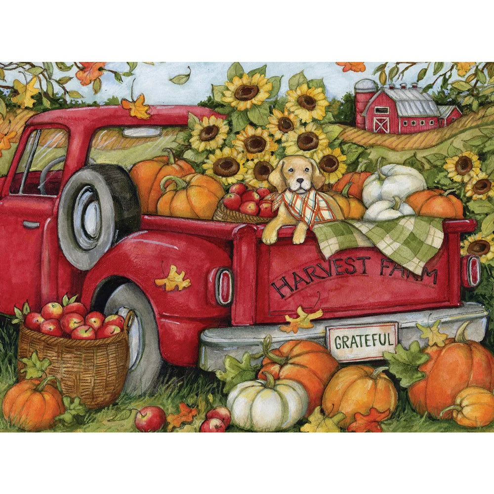 Celebrate autumn with Susan Winget’s Pumpkin Truck jigsaw puzzle, featuring a bright red pickup brimming with pumpkins, sunflowers, and festive fall spirit. A perfect seasonal puzzle for cozy nights and farmhouse décor fans.