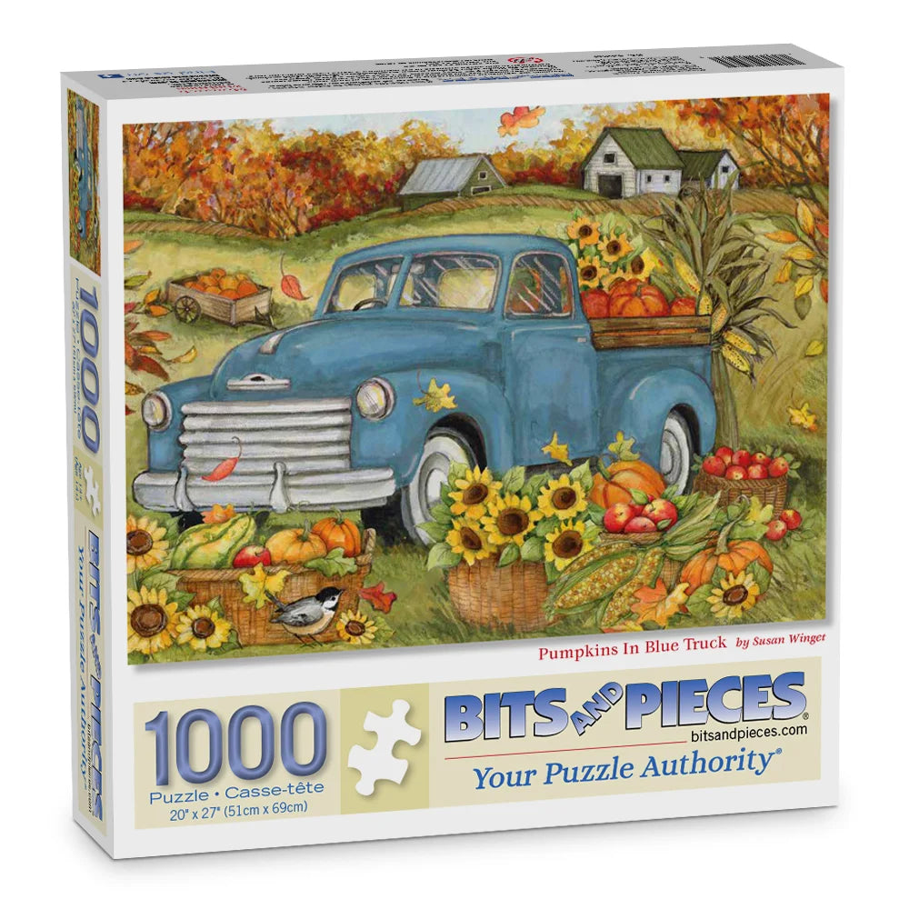 Susan Winget’s Pumpkins in Blue Truck jigsaw puzzle captures a vintage pickup loaded with pumpkins and sunflowers against a peaceful farm backdrop. Ideal for autumn puzzle nights and lovers of nostalgic country scenes.