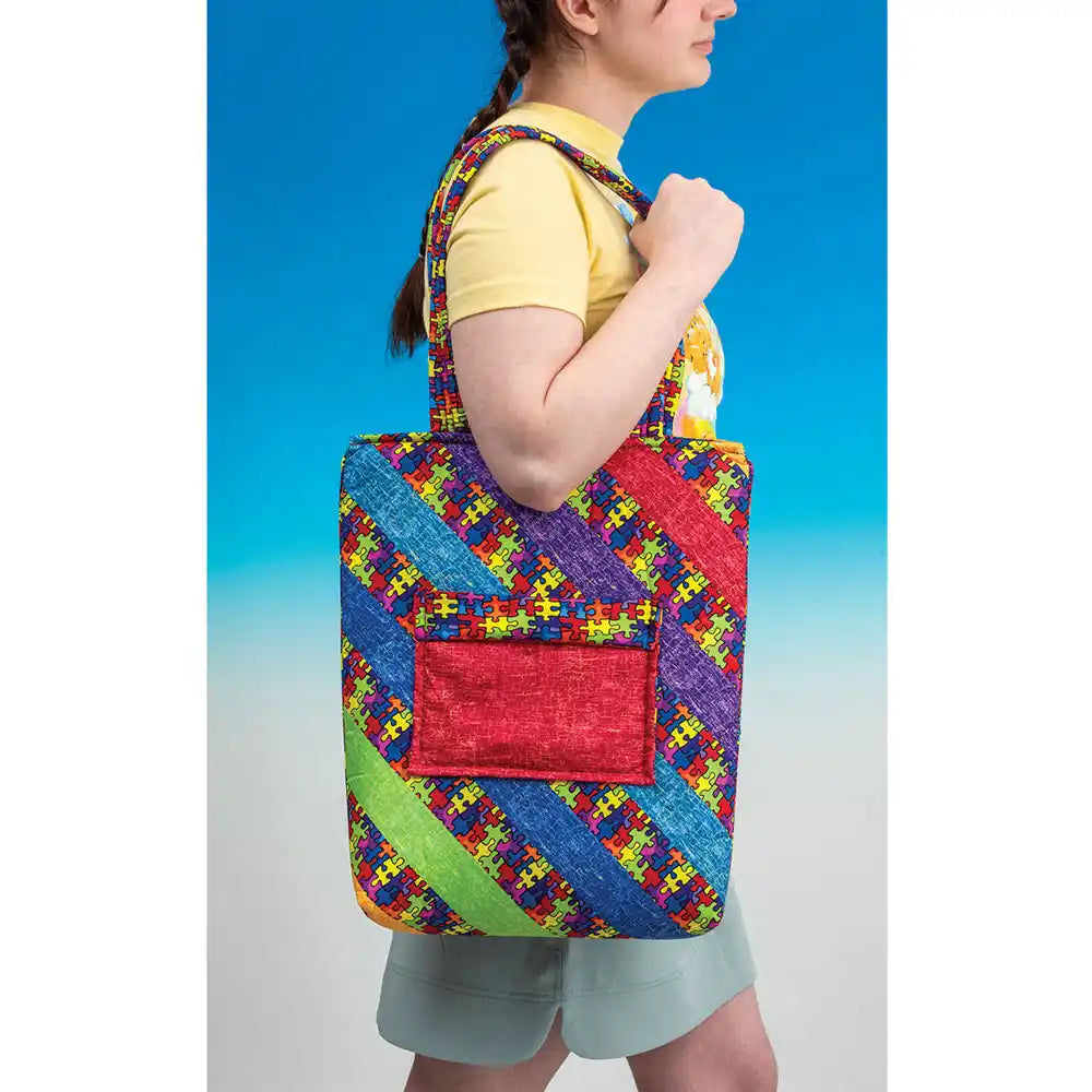 It's the missing piece to your closet! This tote bag isn't just useful, it also has a fun and funky design that complements any outfit. Perfect for taking your favorite puzzles with you or to fill up on errands. Features a front pocket with extra room for anything you need. 3-1/2" x 12" x 16" with a 11-1/2" strap. Poly/cotton. Imported.