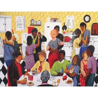 Celebrate connection and culture with this 500-piece jigsaw puzzle by artist Annie Lee. Kitchen Keepers captures a joyful scene filled with dancing, laughter, and card games around a kitchen table. With its signature faceless figures and vibrant storytelling, this 18" x 24" puzzle offers a heartwarming tribute to family, tradition, and everyday moments.