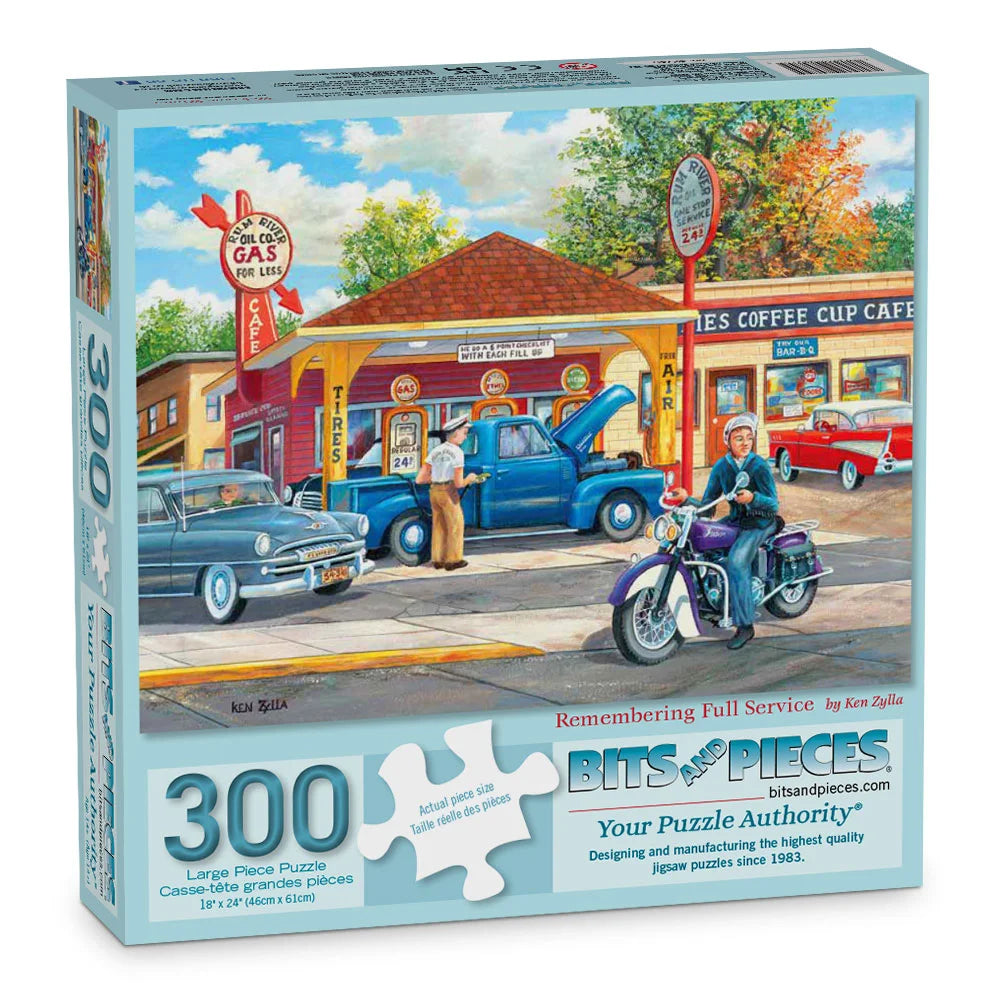 Step back in time with Remembering Full Service by Ken Zylla, a nostalgic scene of vintage cars, classic motorcycles, and friendly gas station service. From the retro signage to the local café next door, every detail captures the charm of small-town life in the good old days. With rich colors and timeless vehicles, this puzzle is perfect for anyone who loves classic Americana and a trip down memory lane.