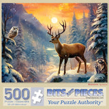 "Reunion" by Shawna Stewart transports you to a serene winter forest, bathed in the golden glow of a setting sun. A majestic buck stands proudly on a snow-covered ridge, while curious raccoons and a watchful owl complete this magical wildlife gathering. The tranquil scene captures the harmony of nature and the quiet beauty of winter, making this puzzle a peaceful and captivating escape.