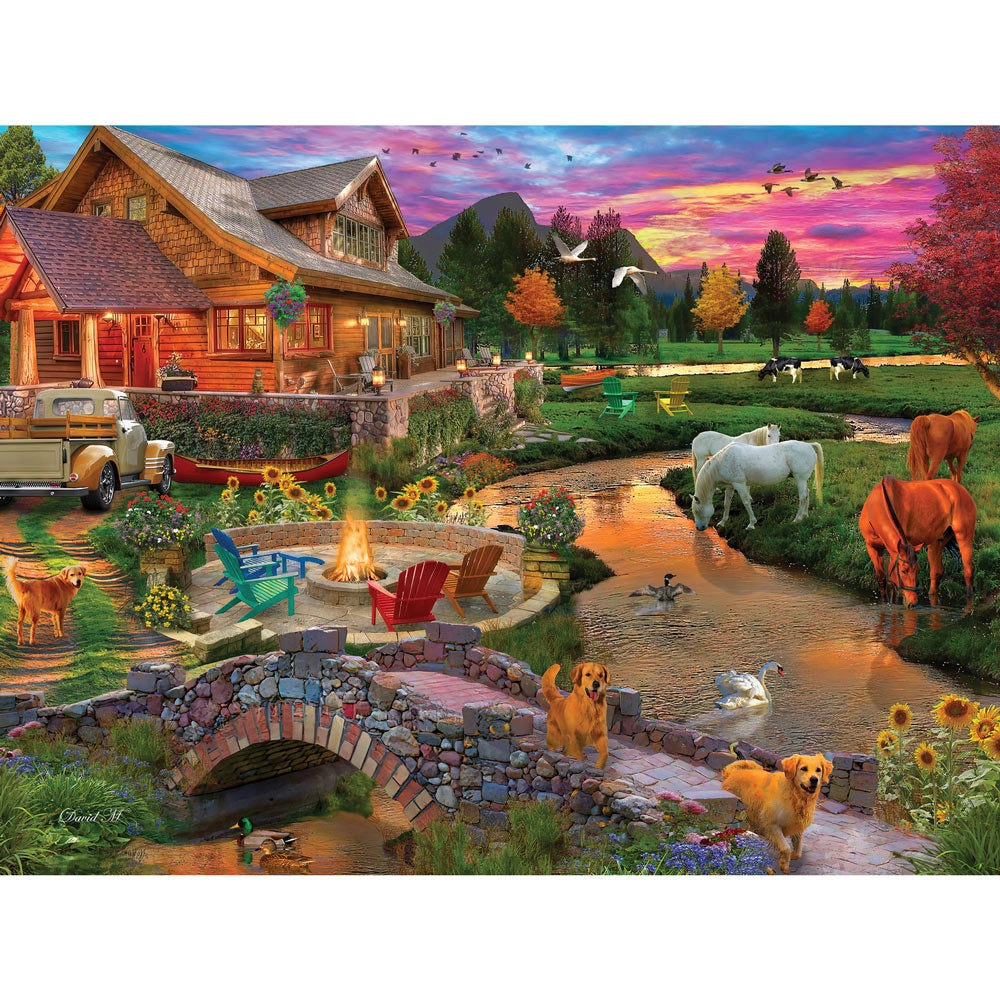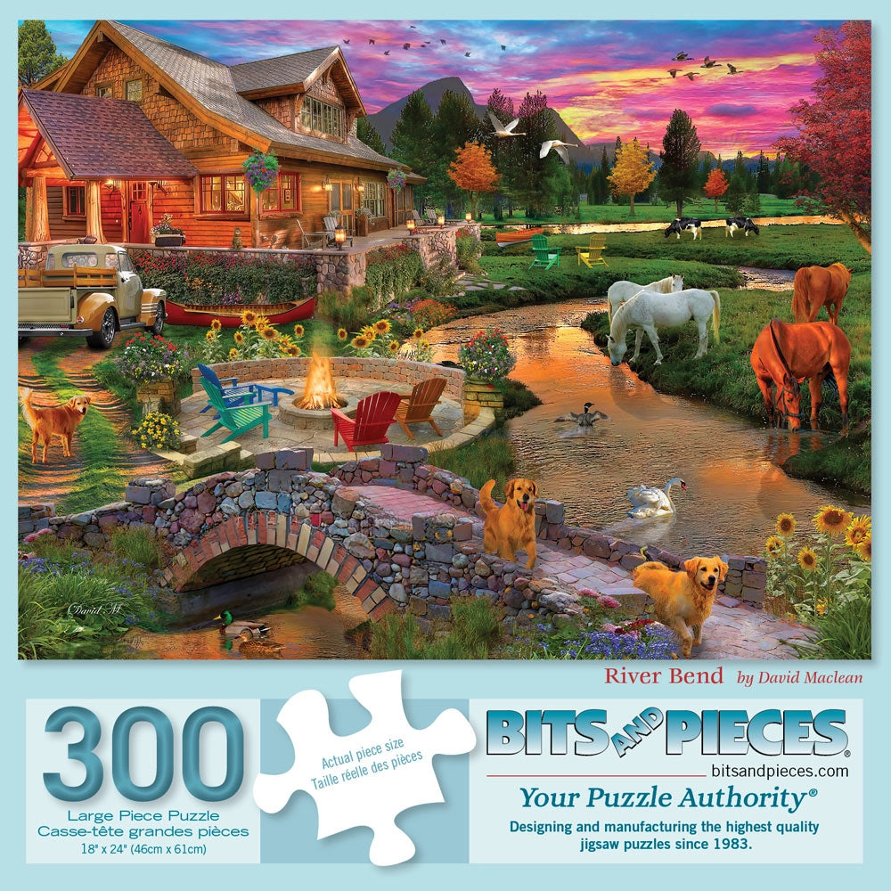 River Bend is a wonderful puzzle for anyone who loves to live life in dreamy color! Golden retrievers frolic through this peaceful mountainside scene, and horses graze in the distance. Pull up a chair alongside the bonfire, and see why puzzle artist David Maclean is such a favorite here at Bits and Pieces. The bright sky and stunning saturation of this puzzle will keep you engaged, whether you choose the challenging 1,000-piece cut or the large-piece 300-count puzzle. Build out your David Maclean collection with River Bend!
