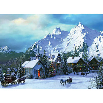 Step into a peaceful alpine village with this 1,000-piece jigsaw puzzle by Dominic Davison. Set against the dramatic backdrop of snow-capped mountains, this serene winter scene features a charming town square decorated for Christmas. A glowing tree, horse-drawn carriages, and warmly lit cottages evoke nostalgic holiday cheer. Perfect for a cozy night in, this puzzle offers a satisfying challenge and a magical scene to enjoy piece by piece. This puzzle measures 19" X 27".