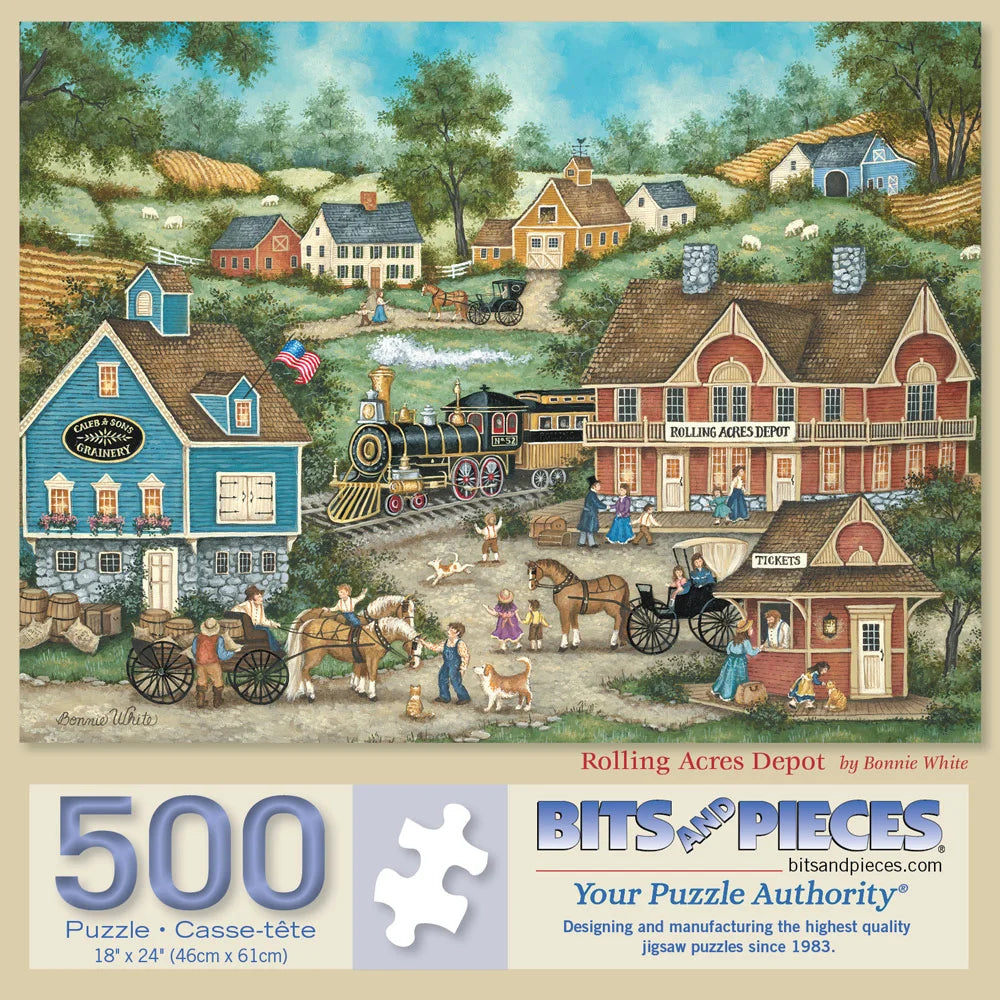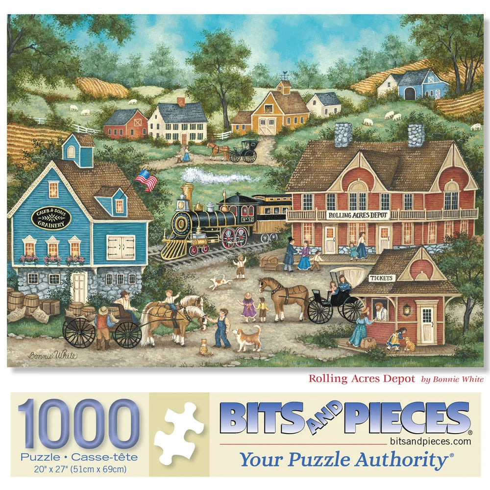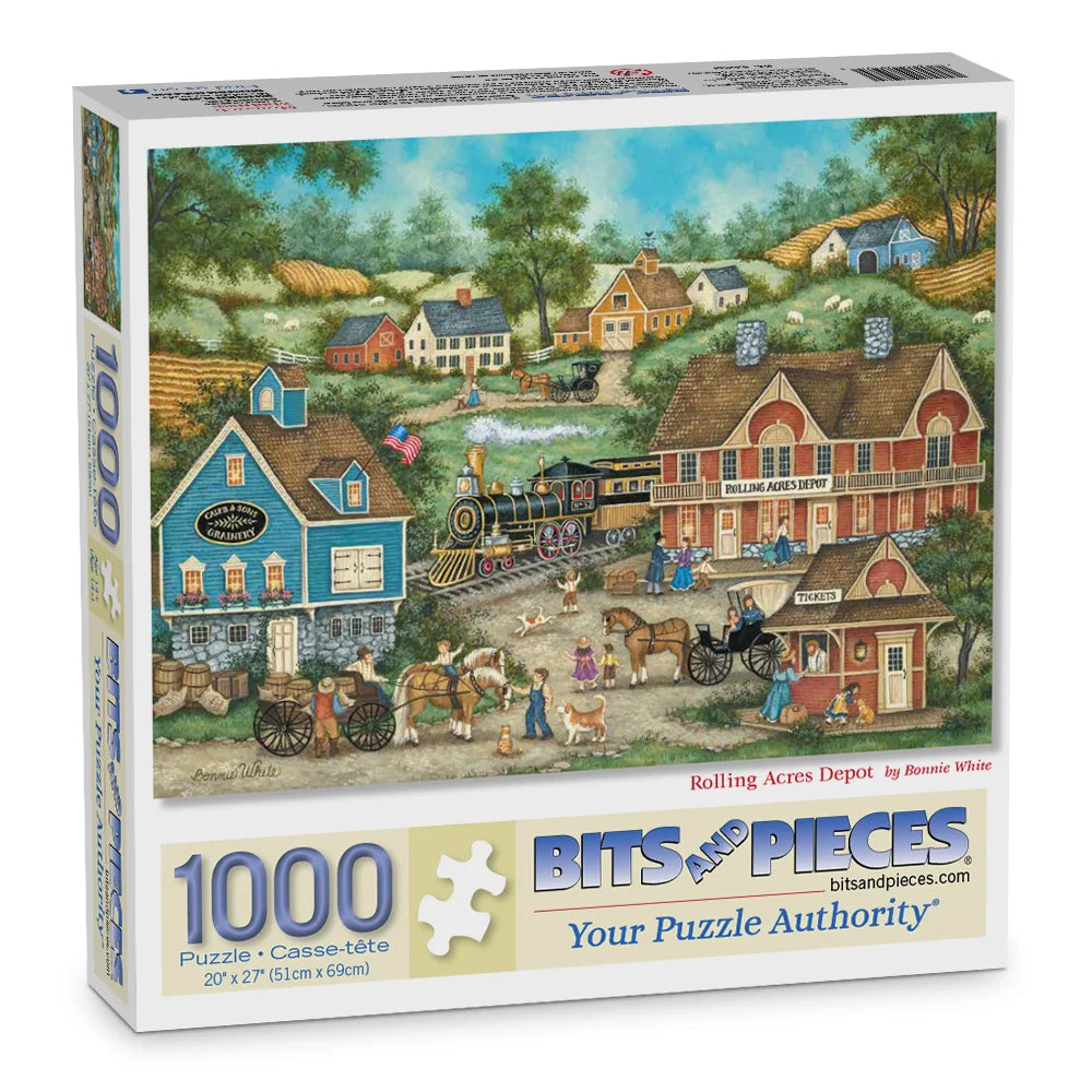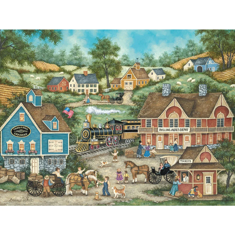 In Bonnie White’s Rolling Acres Depot, a vintage steam train arrives at a bustling small-town station. Farmers, horses, and wagons fill the scene with a nostalgic portrayal of rural life. This charming Americana jigsaw puzzle is perfect for train enthusiasts and fans of historic country settings.