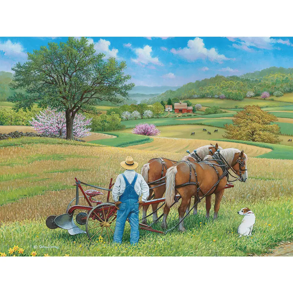 Take in the beauty of rural life with Room to Grow by John Sloane. This picturesque puzzle captures a farmer pausing to admire the vast, rolling fields he’s about to cultivate. With a pair of majestic draft horses ready to plow, a loyal dog by his side, and blooming trees adding bursts of spring color, this tranquil scene is a tribute to the simplicity and promise of a day spent working the land. Perfect for fans of nostalgic and pastoral art, this puzzle invites you to piece together the peace and beauty of country living. Celebrate the heart and harmony of the countryside with Room to Grow!