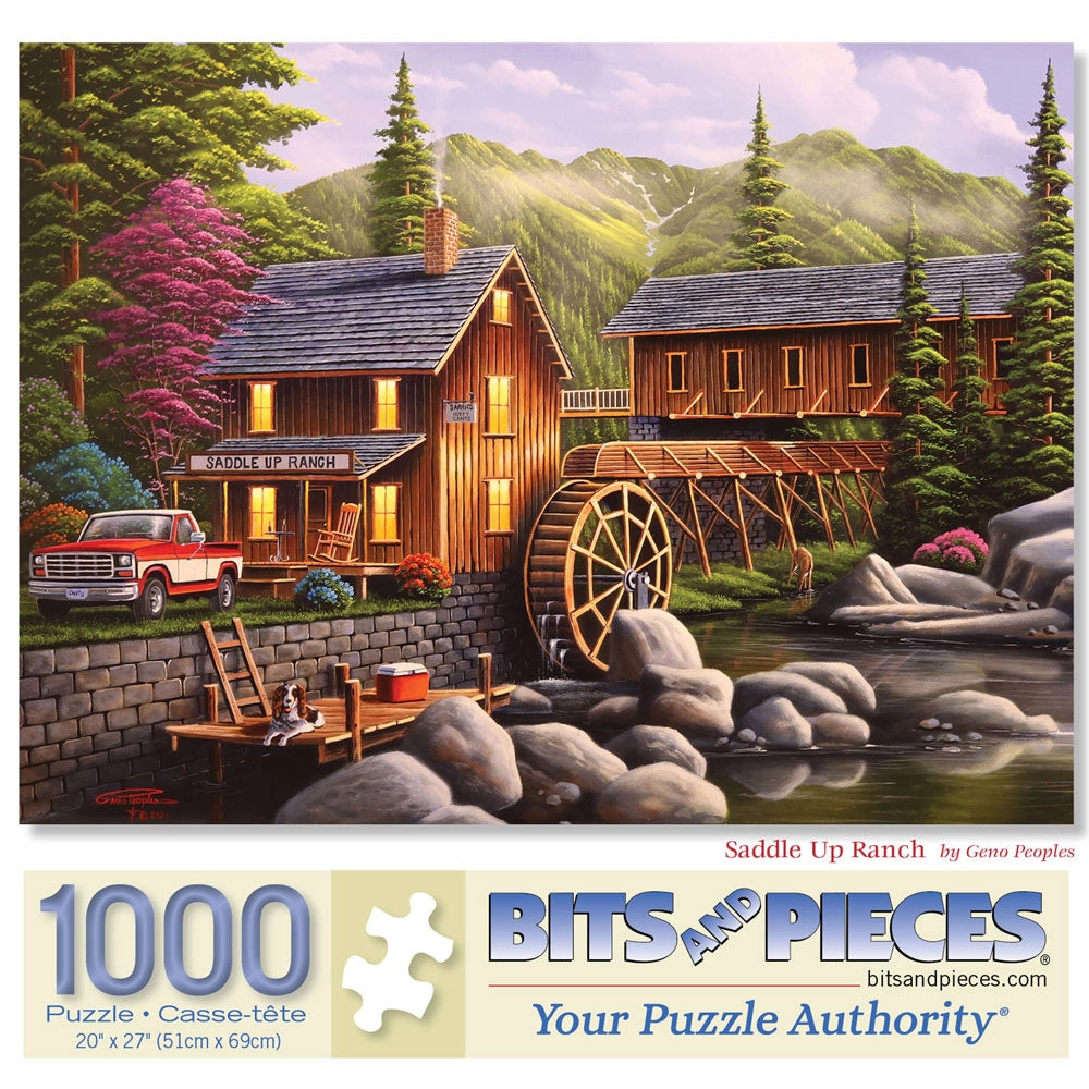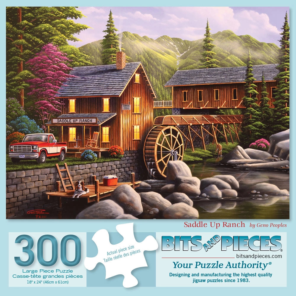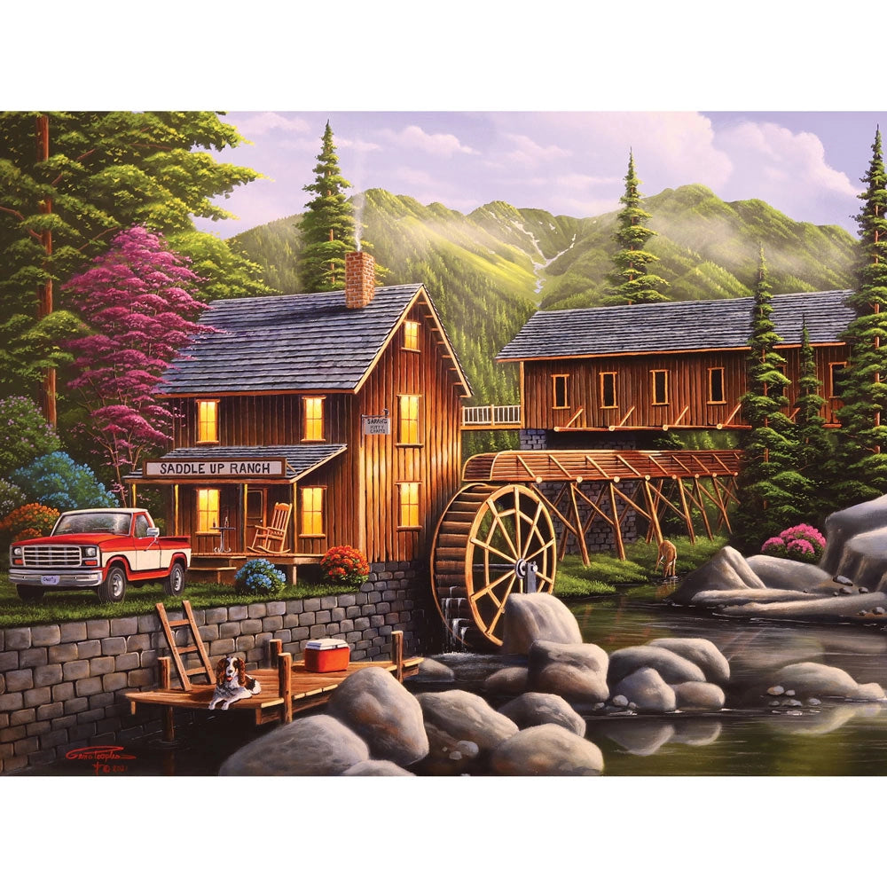 Step into the heart of the countryside with "Saddle Up Ranch," a captivating puzzle by artist Geno Peoples, available in 300 and 1000-piece counts. This enchanting scene brings the essence of rustic tranquility to life. The image features a warmly lit mill, nestled against a backdrop of lush green forest, creating a cozy and inviting atmosphere. In the foreground, a classic red and white truck adds a touch of nostalgic charm, while a picturesque dock extends into the river, where a playful dog explores the scene. Majestic rocks line the riverbank, enhancing the natural beauty of this serene setting. Geno Peoples’ masterful depiction of this rustic landscape makes "Saddle Up Ranch" a perfect choice for puzzle enthusiasts and lovers of countryside charm. Enjoy piecing together this delightful scene and let the peaceful ambiance of the ranch transport you to a serene retreat.