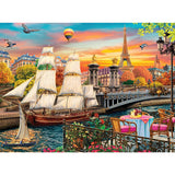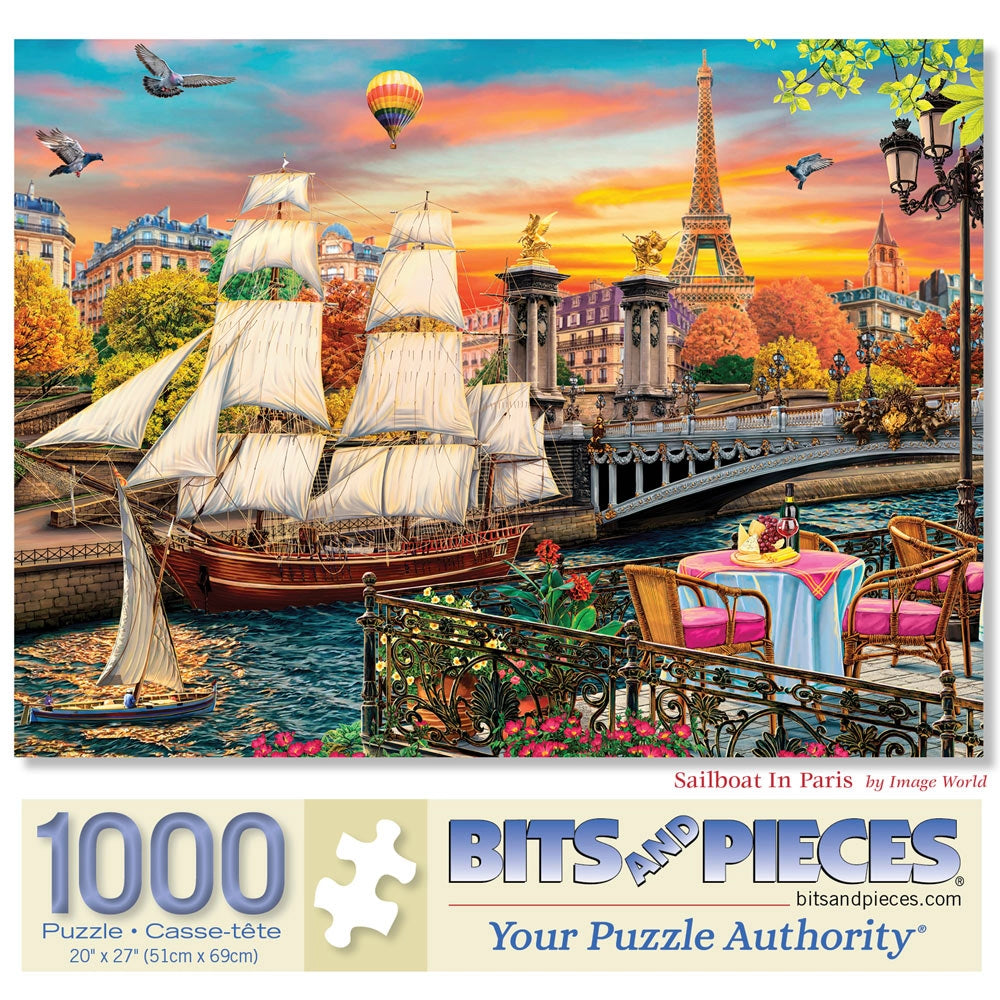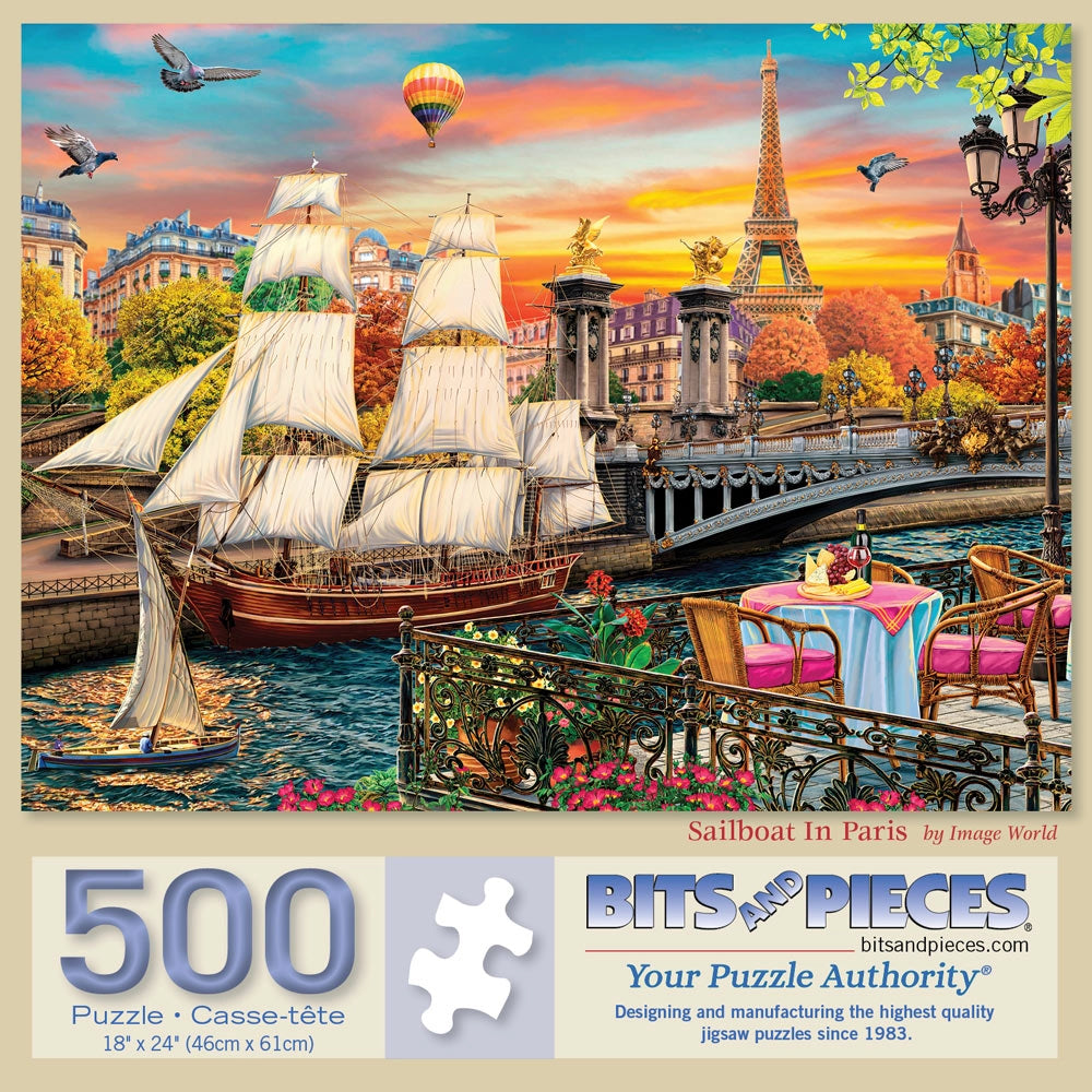 A wildly colorful puzzle with lots of line work! Wind-powered boats sail down a Parisian canal, past seats at a vibrant cafe. The landmarks of Paris gleam in the background, and a hot-air balloon takes off overhead. This one is a perfect puzzle for solvers who like lots of details. Step onto this patio and enjoy the sights of the City of Love over a glass of fine bourdeux. This jigsaw puzzle is designed by Image World and is available in two piece counts.