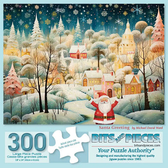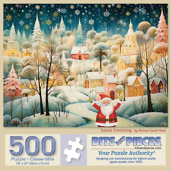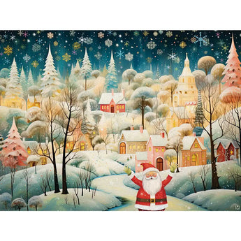 Step into a magical winter wonderland with the Santa Greeting puzzle. This heartwarming scene, painted in soft hues of snow and starlight, captures Santa waving joyfully amidst a charming village blanketed in snow. Twinkling lights and cozy cottages evoke the festive spirit, while delicate snowflakes drift through the night sky.