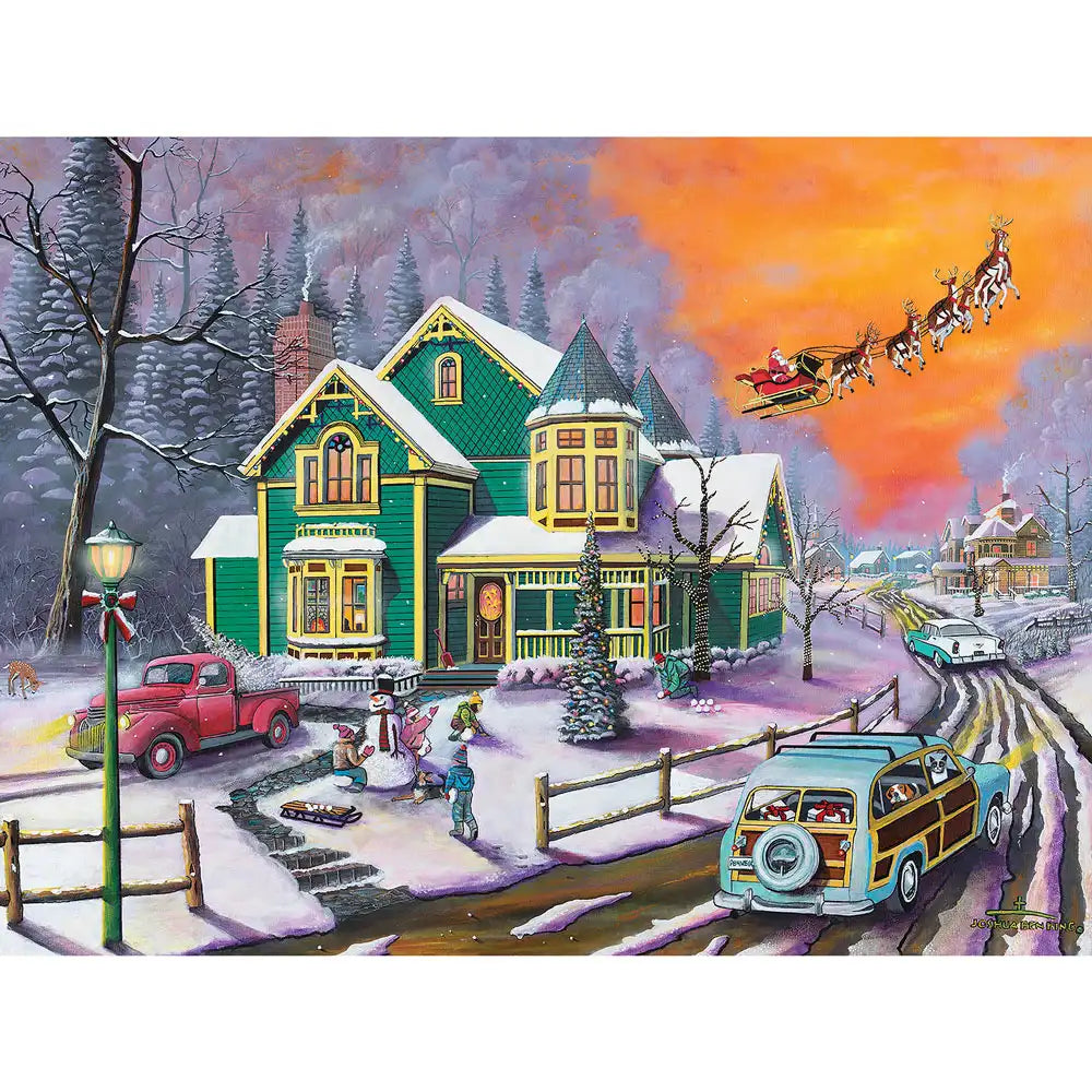 Celebrate the magic of the season with this heartwarming 300 and 500-piece jigsaw puzzle by Joshua Ben King. Featuring a cheerful winter scene with children building a snowman, classic cars, and Santa soaring across a vivid orange sunset sky, this festive puzzle captures the joy and wonder of Christmas Eve. Measuring 18" x 24", it’s the perfect holiday activity for families and puzzle fans alike.