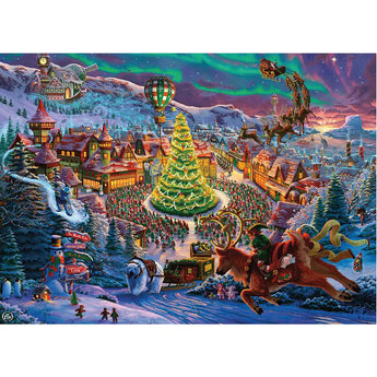Experience the magic of the North Pole with this 1000-piece jigsaw puzzle by Zac Kinkade. Bursting with holiday cheer, this festive puzzle features Santa soaring over a bustling village filled with elves, snowy rooftops, and a glowing Christmas tree at its center. At 19" x 26.6", it’s a vibrant celebration of Christmas tradition that the whole family will enjoy assembling together.
