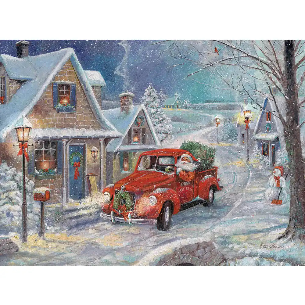 This 500 piece jigsaw puzzle is designed by Ruane Manning and measures 18" x 24". Santa drives his truck through the snowy little town as he makes his Christmas deliveries. Available in two piece count.
