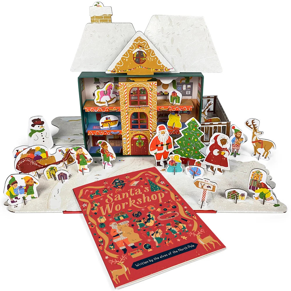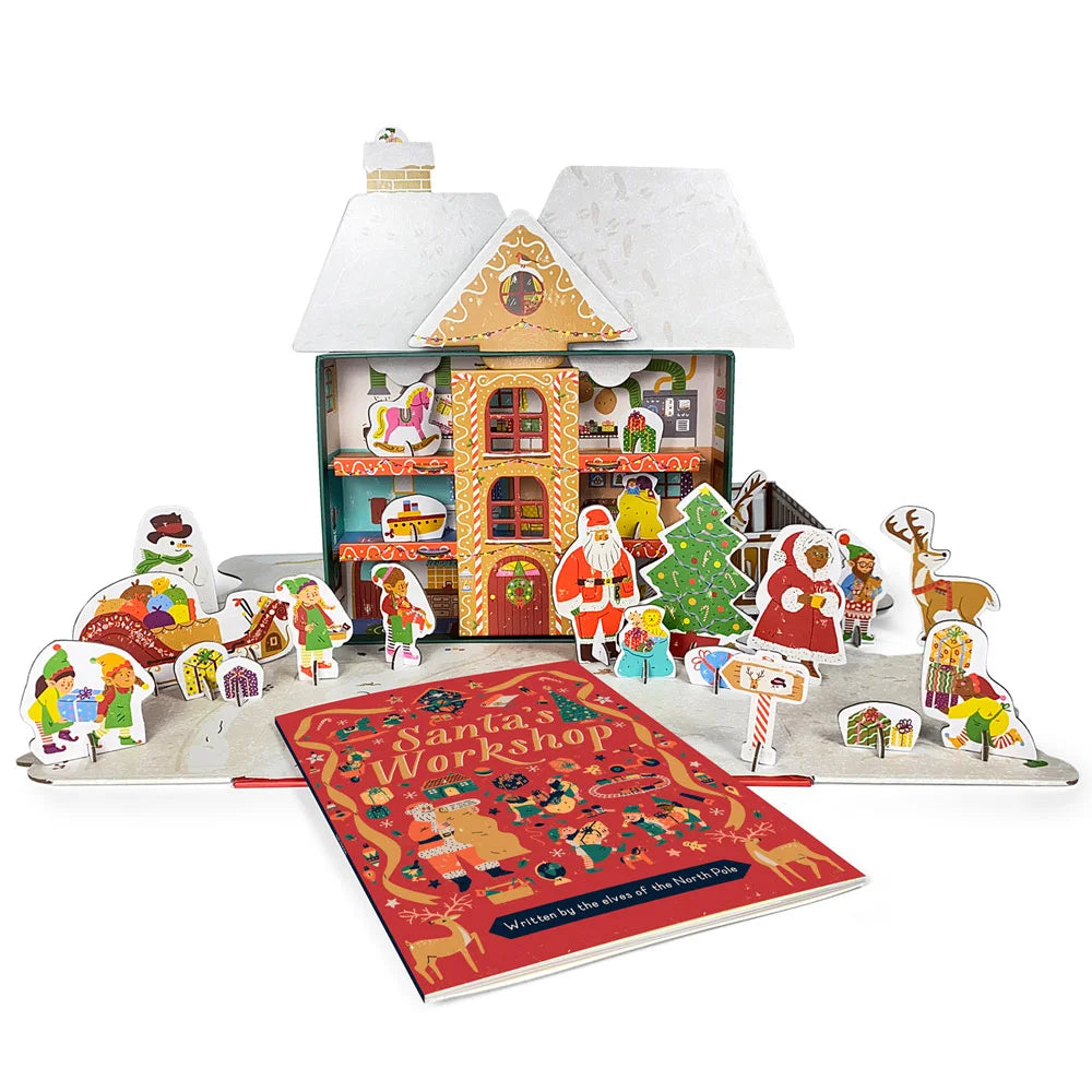 Step inside Santa’s Workshop with this magical box set, featuring an enchanting pop-out-and-play model kit, as well as a colorful guidebook to Santa’s busy headquarters. The workshop features 6 separate rooms over 3 floors, plus 30 buildable characters including elves, reindeer, a snowman, and of course Santa and Mrs. Claus! Set folds back down for easy storage and use year-after-year. 32 pages.