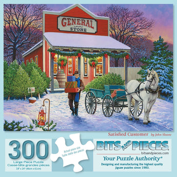 Step into a heartwarming holiday scene with "Satisfied Customer," a delightful puzzle by artist John Sloane. This charming image captures the festive spirit of an evening at a quaint general store during the holiday season. The puzzle depicts a gentleman leaving the store, his arms full of packages, as he heads out into the crisp evening air. Outside, a classic white horse and buggy, waits patiently. The store’s exterior is lined with Christmas trees for sale, adding to the festive atmosphere. The soft glow of a sunset casts a warm, inviting light over the scene, enhancing the holiday cheer. John Sloane’s masterful depiction of this cozy winter scene makes "Satisfied Customer" a perfect choice for puzzle enthusiasts and those who cherish the warmth of the holiday season. Enjoy piecing together this festive puzzle and bring a touch of holiday magic into your home.