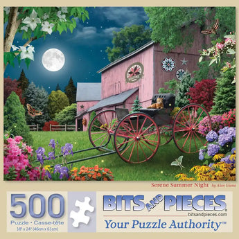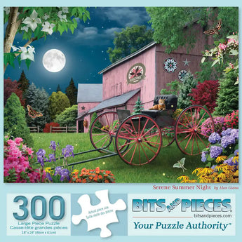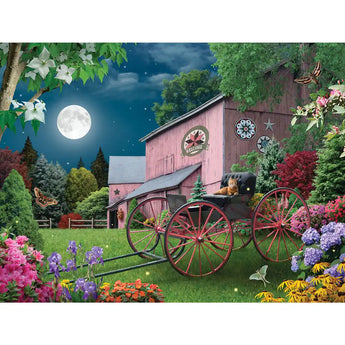 Experience the stillness of a summer evening with Serene Summer Night by Alan Giana. This beautiful scene features a charming barn lit by the moonlight, surrounded by blooming flowers and an old-fashioned wagon, evoking a sense of timeless peace and quiet.