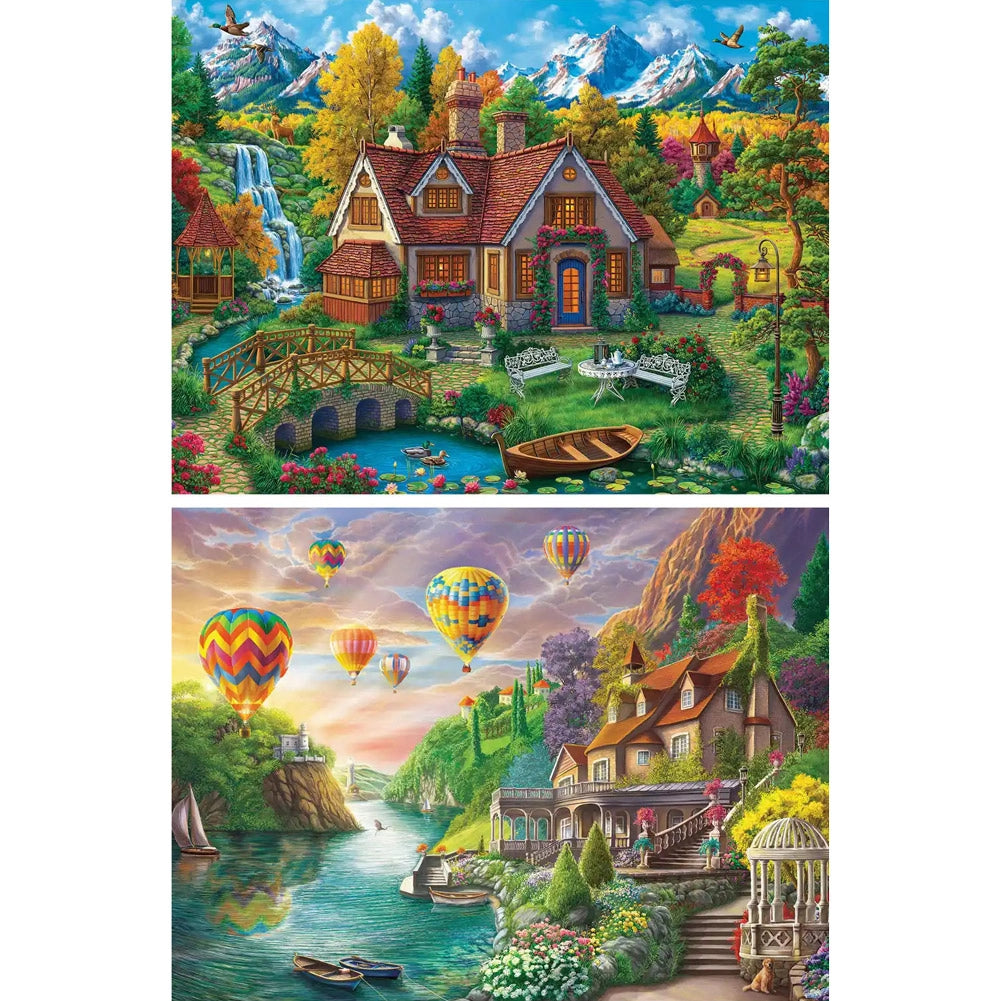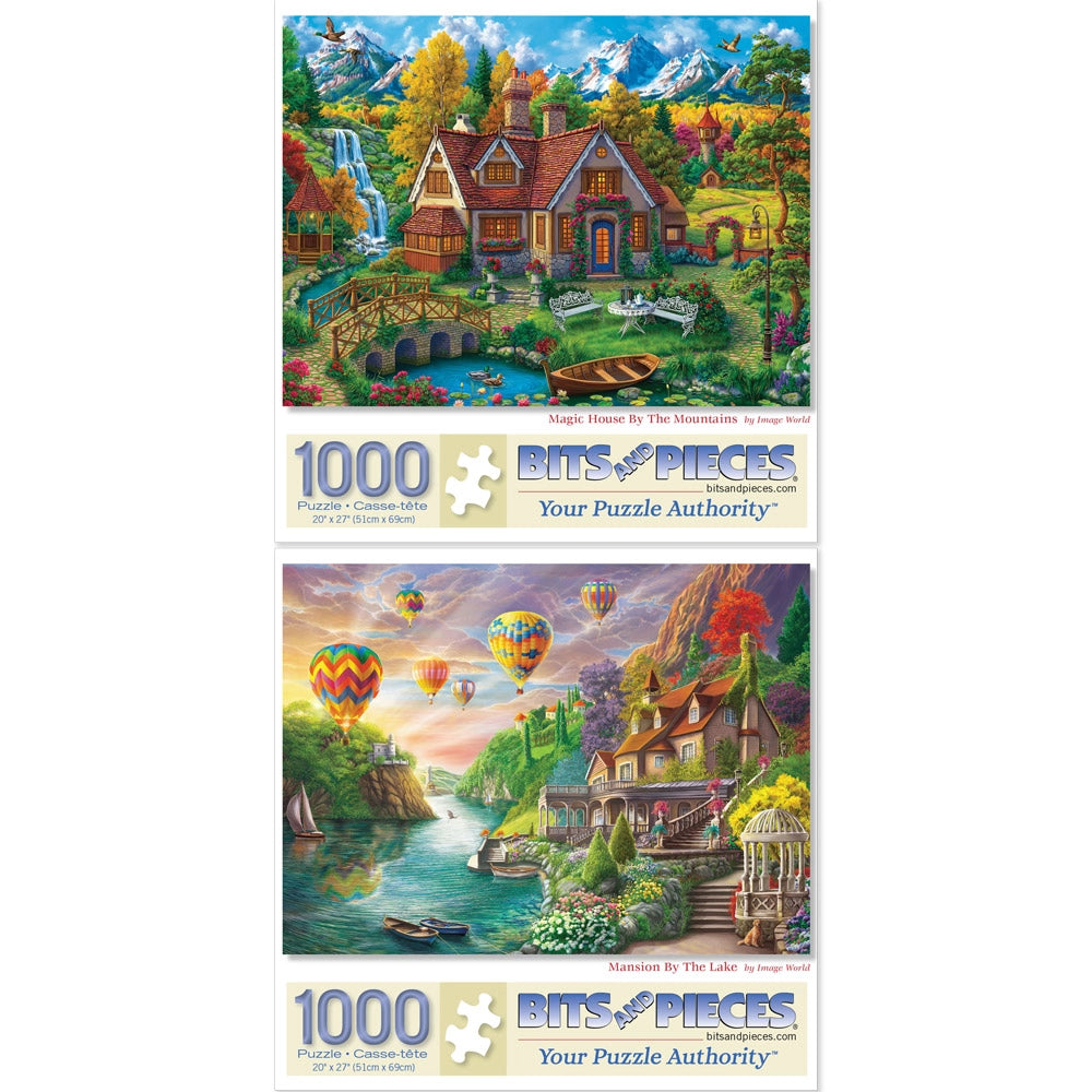 Step into two storybook landscapes with Enchanted Escapes, a magical jigsaw puzzle set from Image World. Mansion by the Lake features a grand waterside home surrounded by floating hot air balloons, while Magic House by the Mountains takes you to a cozy cottage nestled beneath snowy peaks and golden trees. Both puzzles are bursting with color, charm, and whimsical detail—perfect for puzzlers who love fantasy scenery and peaceful escapes.