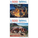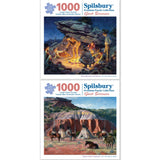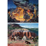 This jigsaw puzzle set of 2 is designed by Jack Sorenson. Puzzles are renowned for their engaging complexity, offering a satisfying challenge with their smaller, intricate pieces. This set of 2 puzzles features the vivid scenes of the West - the first puzzle captures the serene ambiance of a group of horses near a teepee amidst the red desert sands, while the second puzzle immerses you in the rustic charm of cowboys gathered around a nighttime fire, preparing coffee, biscuits, and beans. Available in multiple piece counts. This set contains following puzzles-