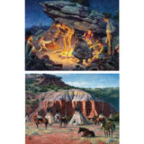 This jigsaw puzzle set of 2 is designed by Jack Sorenson. Puzzles are renowned for their engaging complexity, offering a satisfying challenge with their smaller, intricate pieces. This set of 2 puzzles features the vivid scenes of the West - the first puzzle captures the serene ambiance of a group of horses near a teepee amidst the red desert sands, while the second puzzle immerses you in the rustic charm of cowboys gathered around a nighttime fire, preparing coffee, biscuits, and beans. Available in multiple piece counts. This set contains following puzzles-