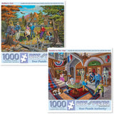 Have twice the amount of fun with the Set of 2: Murder Mystery Jigsaw Puzzles, which contain the Robber's Nest Piece Jigsaw Puzzle and the Murder in The Alps Piece Jigsaw Puzzle. Both mystery jigsaw puzzles were designed by the brilliant artist Gene Dieckhoner and available in two piece counts.