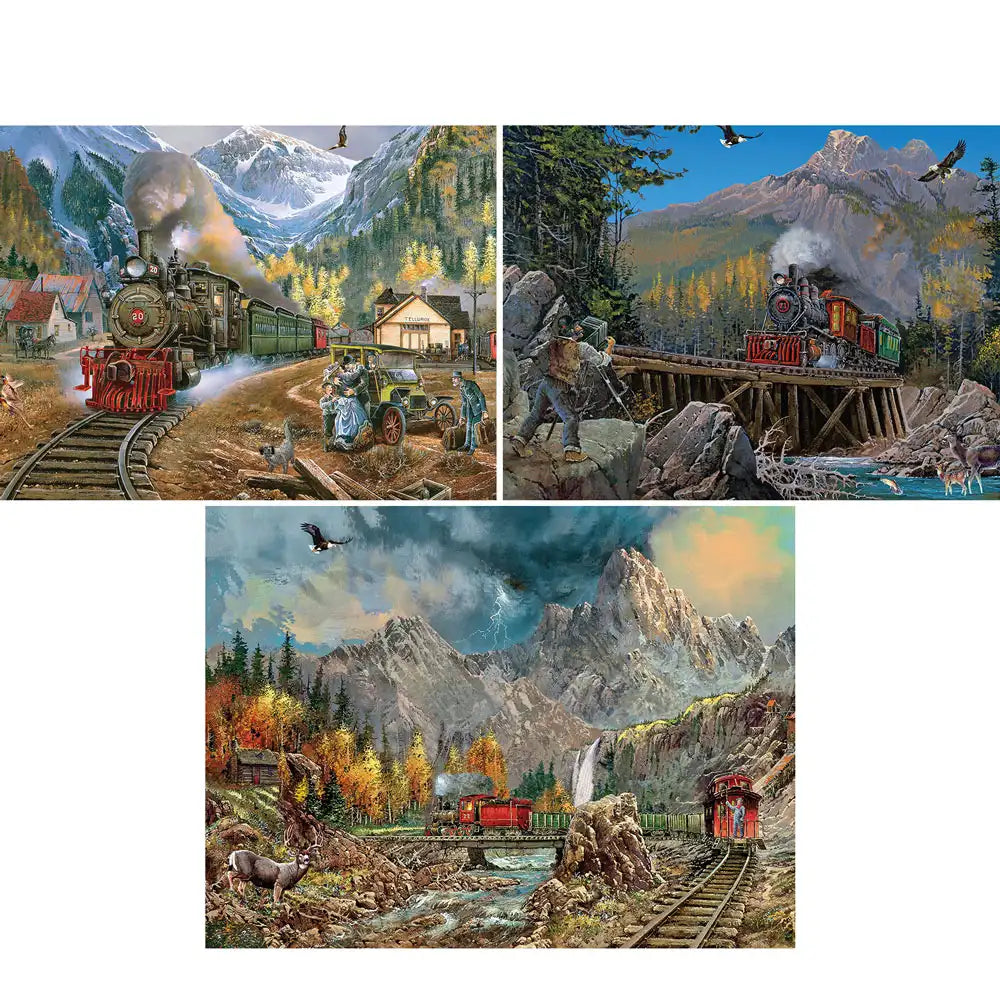 Ted Blaylock is an artist with a love of depicting trains through his eyes. Born and raised in Missouri, he had an interest in art starting at the age of seven when he made his own easel out of sticks and painted a picture of a tree in the park with his watercolors. As an adult, he spent his free time drawing and painting. After working jobs far from professional art, Blaylock followed his passion in 1969 and opened an art gallery and institution in Illinois. He resides in Arizona with his family. Each 750 piece jigsaw puzzle measures 18" x 24".