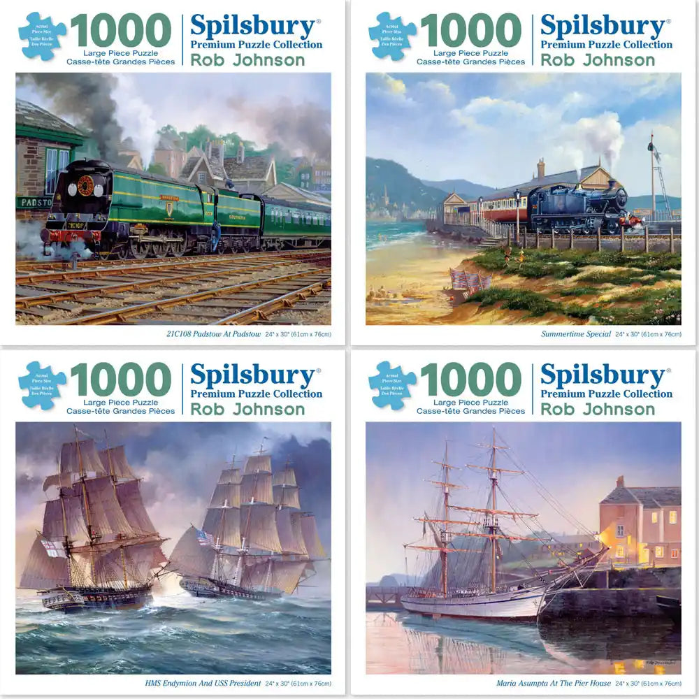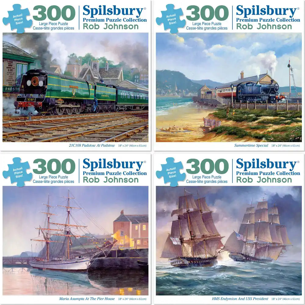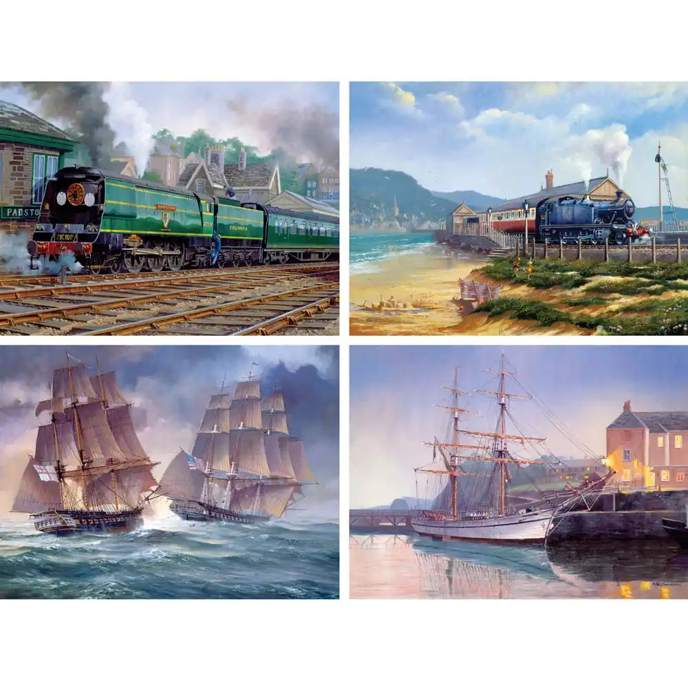 Each puzzle transports you to a different era, from the classic steam locomotives at the station to the majestic ships sailing the high seas. Experience the thrill of a seaside railway adventure, and the charm of historical vessels docked at the pier. Ideal for puzzle enthusiasts who appreciate the romance of travel and history. This captivating set of four puzzles designed by Rob Johnson is available in two piece counts.