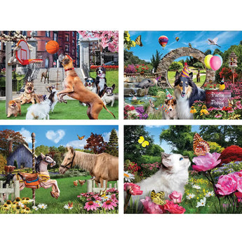 Step into a world of fun and mischief with Karen Burke’s delightful artwork in this set of 4 puzzles. From playful pups shooting hoops and garden parties with furry friends to curious animals exploring the great outdoors, each puzzle is filled with vibrant colors and lighthearted charm. Puzzles consisting of 1,000 pieces are renowned for their engaging complexity, offering a satisfying challenge with their smaller, intricate pieces. Each piece jigsaw puzzle is designed by Karen Burke.