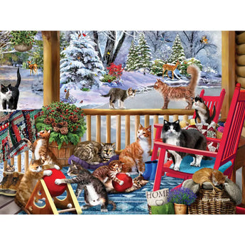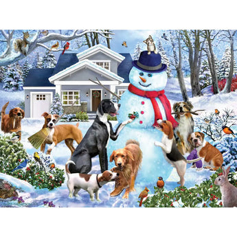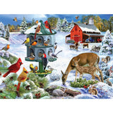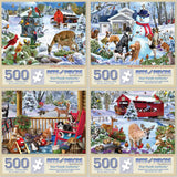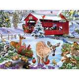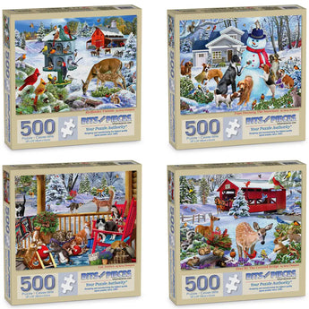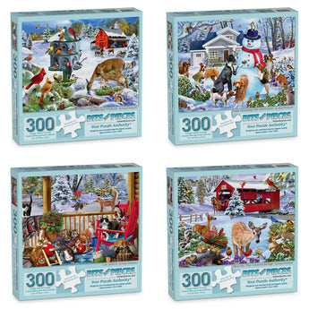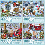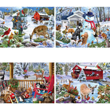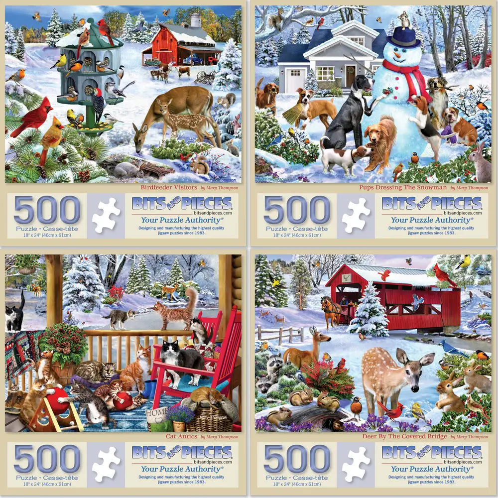 Celebrate the beauty of winter with this delightful set of four puzzles by Mary Thompson. Each scene captures the magic of the season in her signature style. Birdfeeder Visitors showcases a snowy barnyard alive with vibrant birds and curious deer. Pups Dressing the Snowman is a heartwarming glimpse of playful dogs bringing a snowman to life. In Cat Antics, mischievous felines create cozy chaos on a snowy porch. Deer by the Covered Bridge invites you to a serene countryside where wildlife frolics around a charming red bridge. This collection offers hours of joy and seasonal charm.