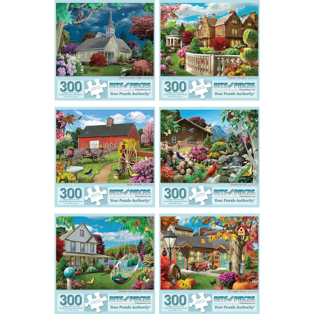 Charming Countryside Vistas jigsaw puzzle set of 6 is designed by Alan Giana. Puzzles are renowned for their engaging complexity, offering a satisfying challenge with their smaller, intricate pieces. Embark on a captivating journey with this set of 6 puzzles, each portraying a different enchanting scene. From moonlit churchyards with watchful owls to splendid mansions surrounded by vibrant gardens, and classic red barns amid fluttering butterflies, these puzzles invite you to explore the beauty of nature and the changing seasons, all while capturing the charm of idyllic countryside settings.