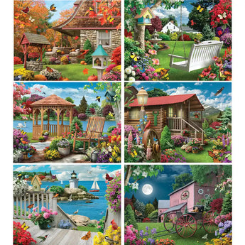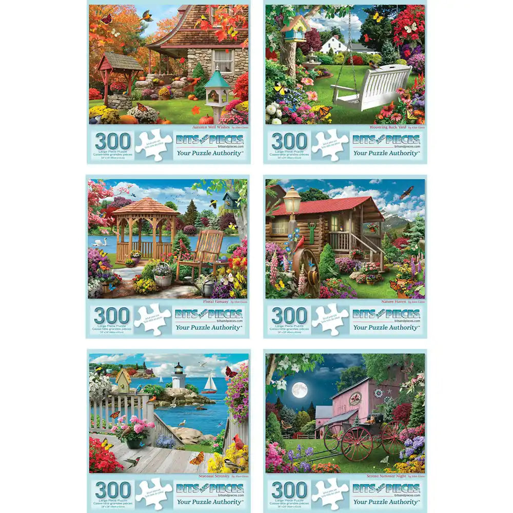 Bring the beauty of the countryside and coastal serenity into your home with this value set of six stunning puzzles by Alan Giana. Each puzzle captures a unique and peaceful scene, from the vibrant colors of Autumn Well Wishes and the garden tranquility of Blooming Backyard, to the coastal charm of Seacoast Serenity. Enjoy the charm of Floral Fantasy's floral oasis, escape to a peaceful retreat with Nature Haven, and unwind under the moonlight with Serene Summer Night. Perfect for puzzlers of all ages, this collection offers hours of relaxation and fun.