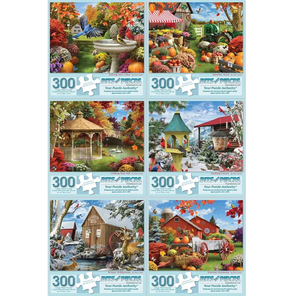 Alan Giana is a contemporary American artist best known for his vibrant and idyllic landscape paintings–especially those depicting autumn. His works have a peaceful, dreamlike quality–perfect for an escape into a simpler, more beautiful world. These nostalgic, comforting scenes are perfect for a relaxing moment of puzzling. With this set, you can save big by buying six puzzles at once! Stock up and always keep a puzzle going this cozy fall season. Choose from three piece counts for the right challenge level.