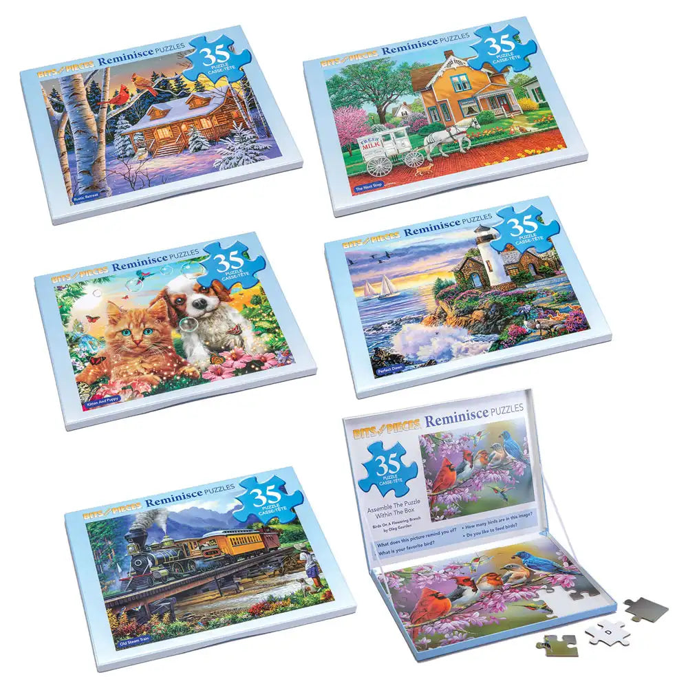 Reconnect with cherished memories through our set of six Reminisce puzzles, featuring beautiful scenes by a variety of talented artists. Designed with extra-large pieces for easy handling, each puzzle transports you to a place of warmth and nostalgia. From the cozy charm of Rustic Retreat by William Vanderdasson to the scenic journey of The Next Stop by John Sloane, every scene is crafted to evoke the joys of simpler days. Whether it’s the gentle colors of Perfect Dawn, the classic charm of Old Steam Train, or the vibrant beauty of Birds On A Flowering Branch, each puzzle offers a calming escape. Perfect for all ages, this collection is available in both 16 and 35 piece counts for a satisfying yet gentle challenge.