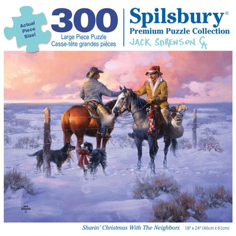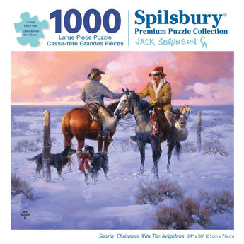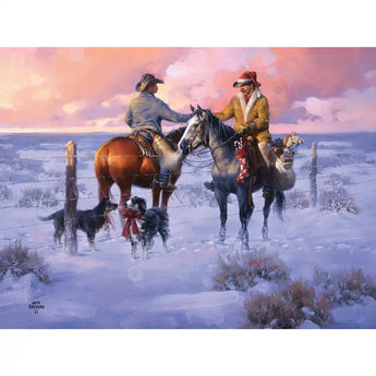 This jigsaw puzzle is designed by Jack Sorenson. Puzzles are renowned for their engaging complexity, offering a satisfying challenge with their smaller, intricate pieces. Two neighbors on horseback exchange Christmas greetings across a snowy landscape, one holding a festive stocking. A fence separates them, but their dogs on the ground eagerly join in the friendly reunion, creating a heartwarming winter scene. Available in multiple piece counts.