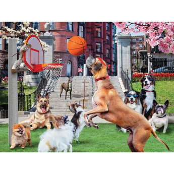Who says dogs can’t play basketball? Watch as this pack of playful pups takes over the court for a hilarious game of hoops. Full of energy, color, and adorable antics, this puzzle is a slam dunk for animal lovers and sports fans alike. This jigsaw puzzle is designed by Karen Burke