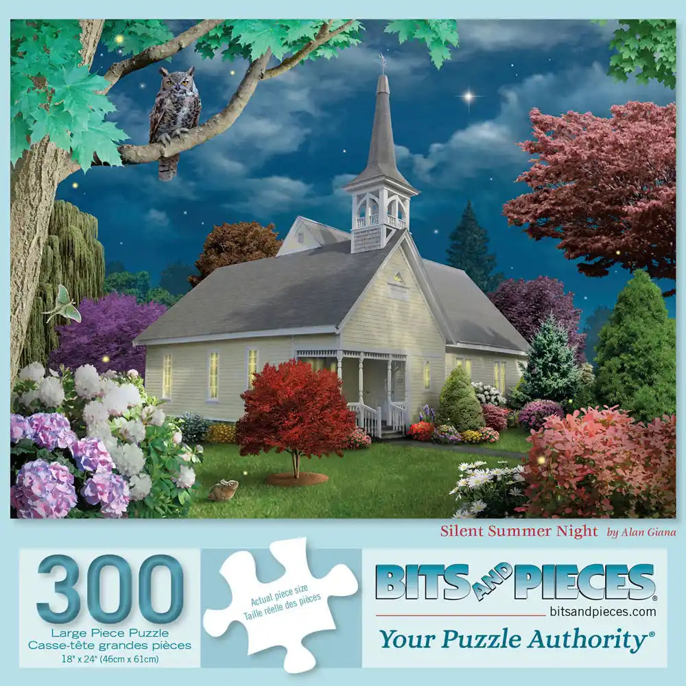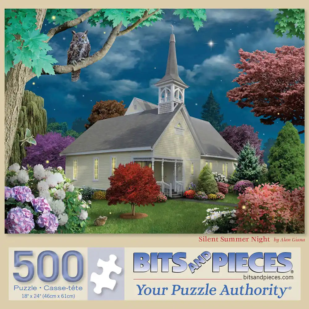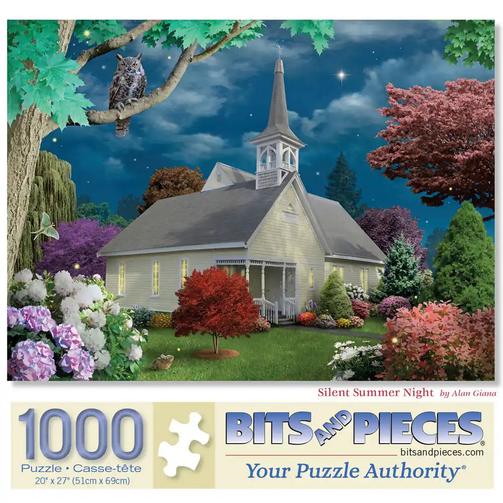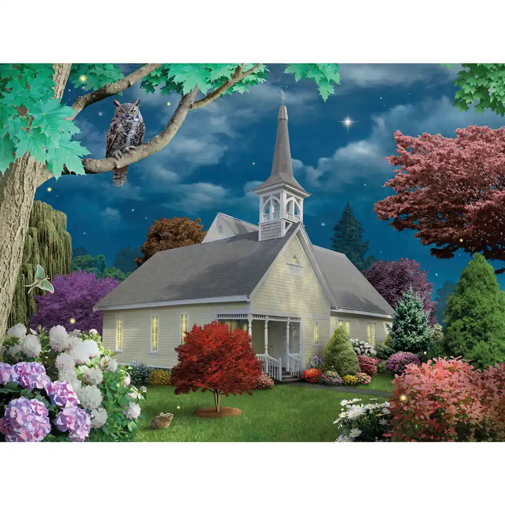Silent Summer Night puzzle is designed by Alan Giana. Puzzles are renowned for their engaging complexity, offering a satisfying challenge with their smaller, intricate pieces. This picturesque scene showcases a charming church under the moonlight, accented by the watchful presence of an owl perched on a nearby tree. Hydrangea bushes add a touch of natural beauty to this enchanting puzzle, inviting you to capture the magic of a serene summer night as you piece it together. Available in multiple piece counts.